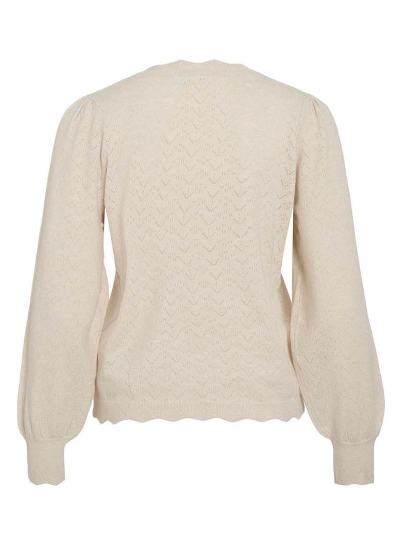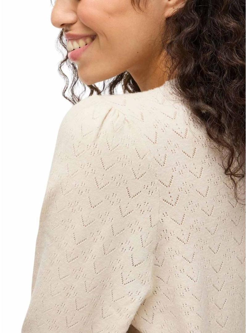 Camisola Vila. Cor bege. Malha de ponto pointelle. Decote redondo. Acabamentos com ondas. Manga comprida. Corte regular. Malha suave e elástica.