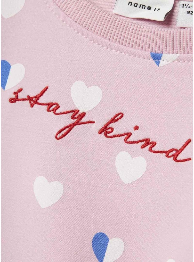 Moletom Name It. Cor rosa. Formato longo. Estampa de corações. Texto no peito. Manga comprida. Acabamentos canelados.