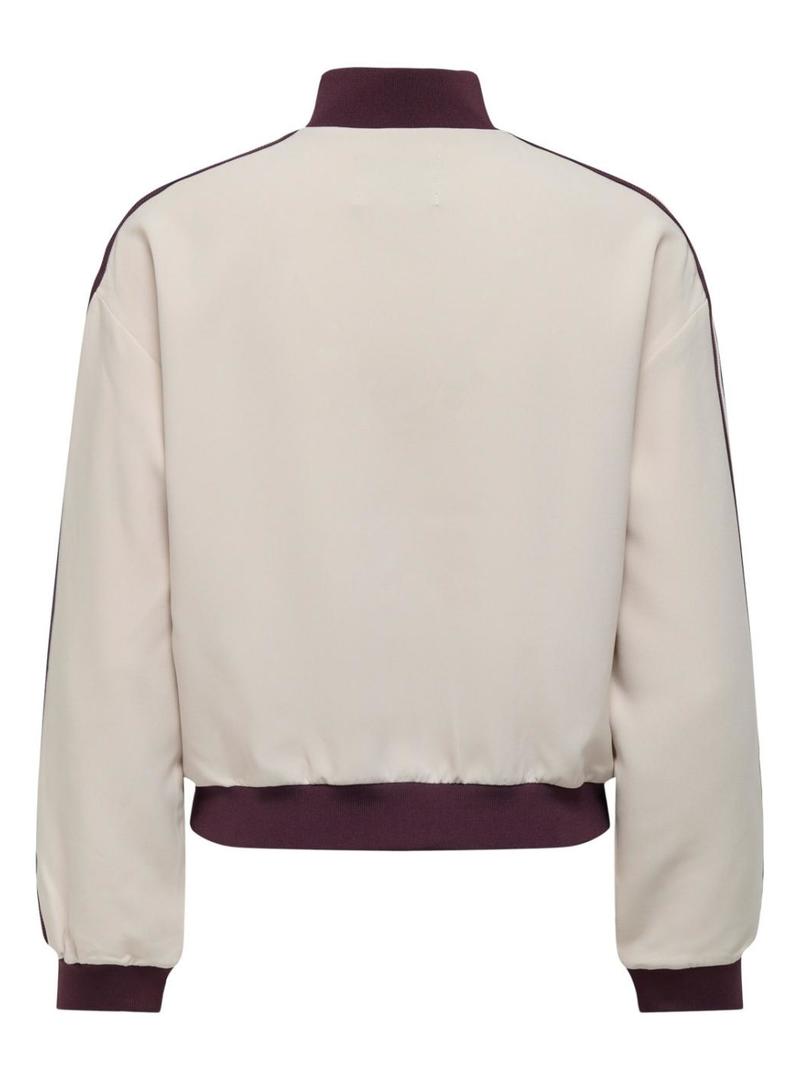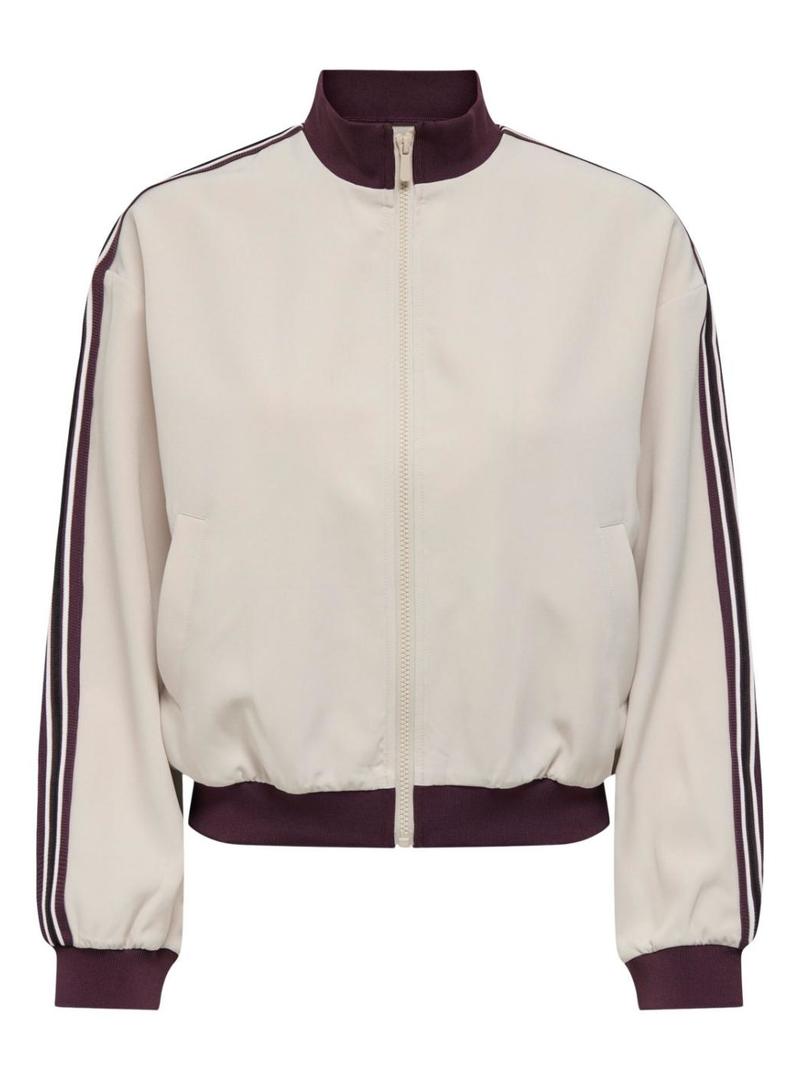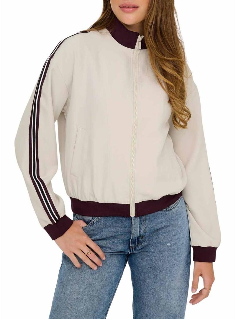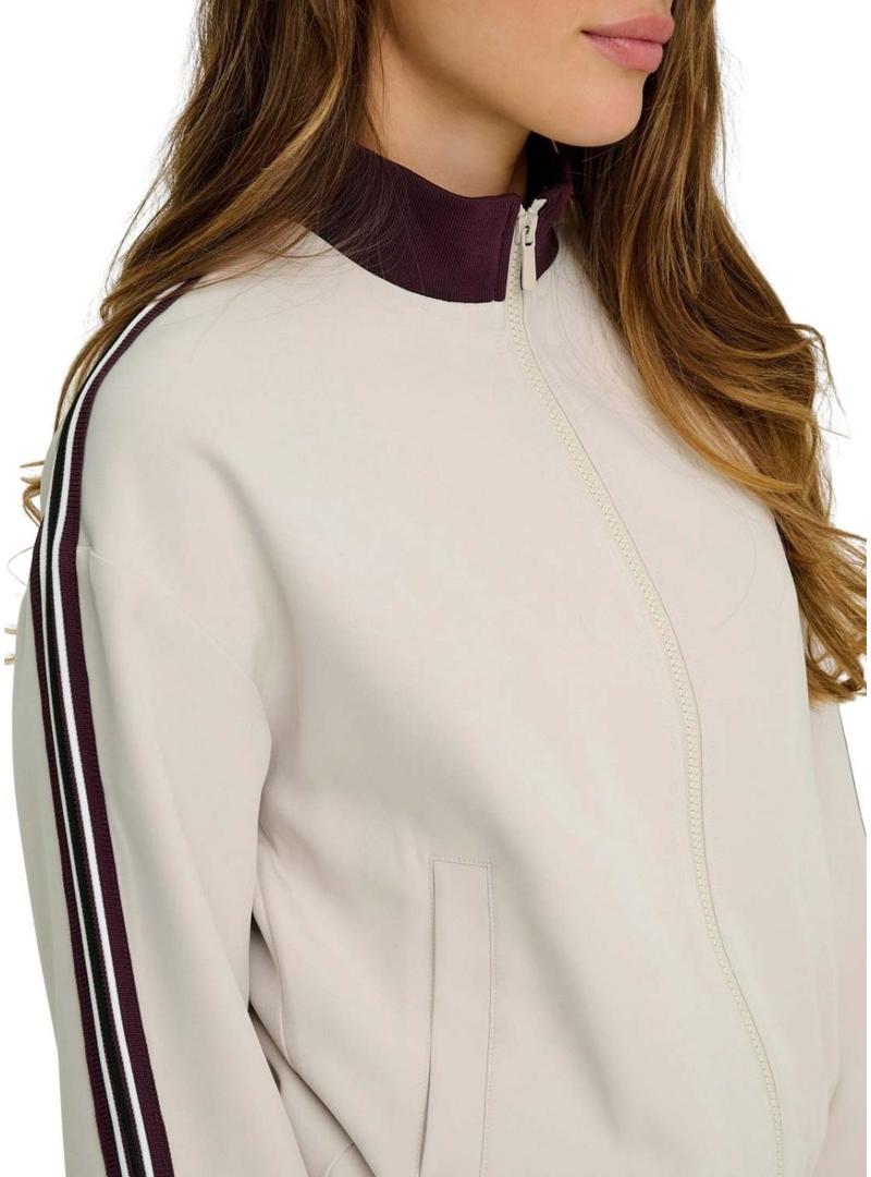 Casaco Only. Modelo Mellie. Cor bege. Fecho com zíper. Gola alta. Extremidades acanaladas. Bolsos laterais. Detalhes em cor de vinho. Faixa esportiva nos lados das mangas.
