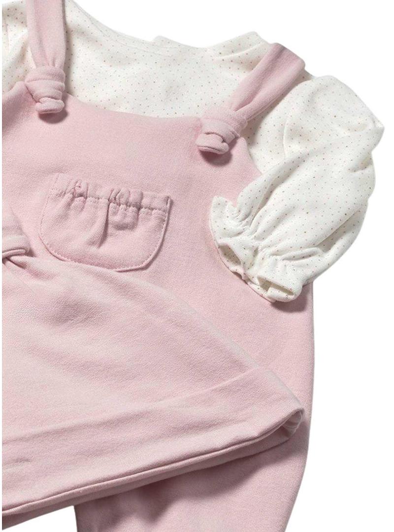 Conjunto Mayoral de 2 peças. Cor rosa. Macacão de manga comprida. Para recém-nascido. Jardineira com camiseta sobreposta. Fechamento com botões na parte de trás. Botões de pressão na entreperna. Fundo com pés. Touca rosa. Tecido macio.