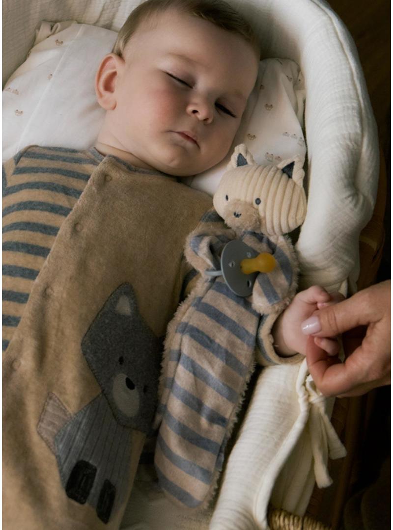 Gugú Mayoral pendura chupeta listrada para bebê.