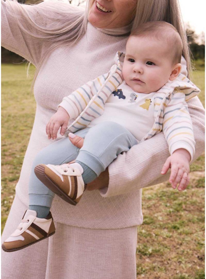 Conjunto de 3 peças Mayoral, polaina e gorro bege para bebê.