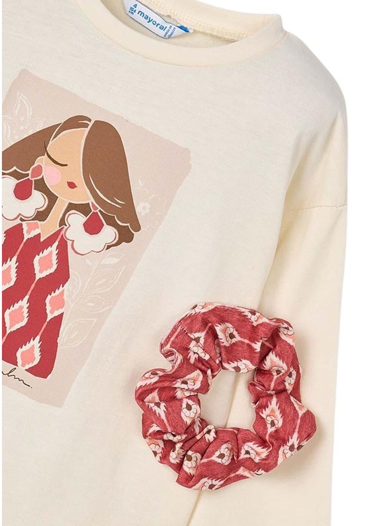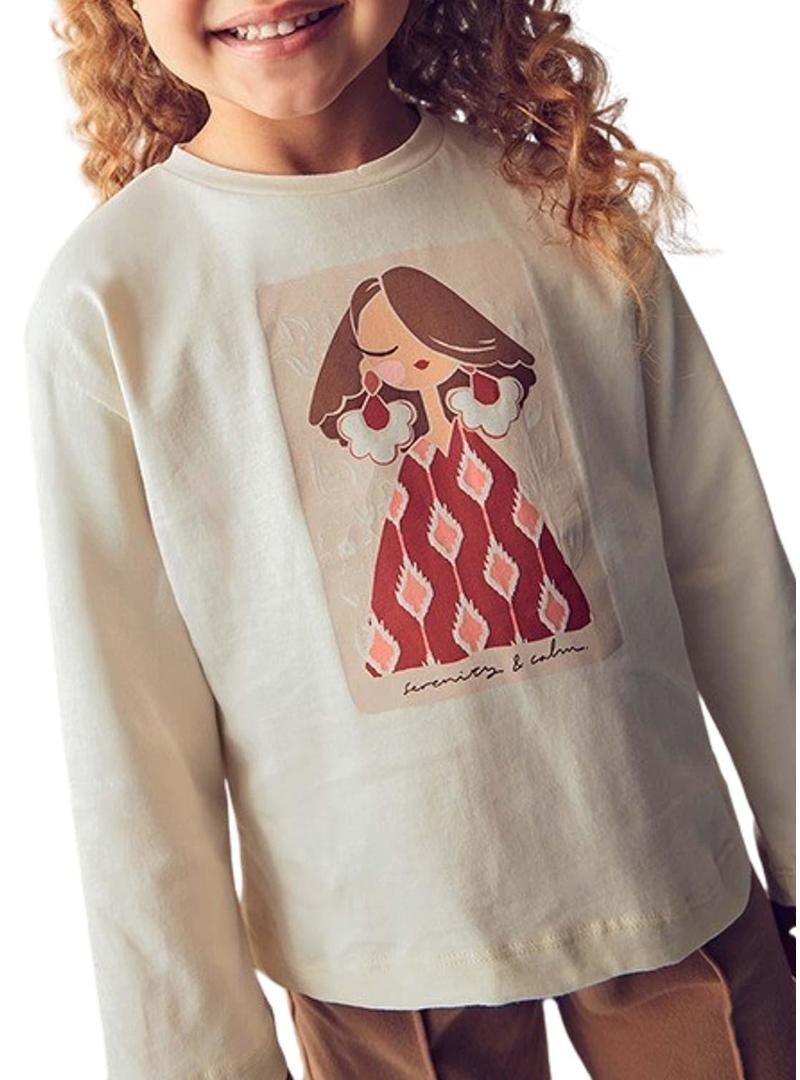 Camiseta de manga comprida. Cor bege. Gola redonda. Manga comprida. Estampado no peito. Elástico estampado a combinar.