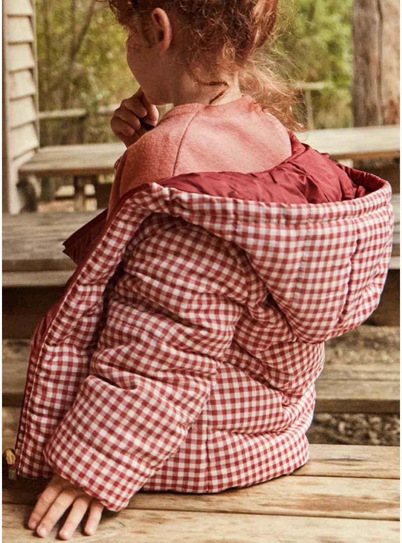 Casaco Mayoral. Cor granada. Manga comprida. Gola alta. Com capuz. Fecho frontal com zíper. Exterior têxtil acolchoado. Modelo reversível. Interior com estampa de xadrez. Parte traseira ligeiramente mais comprida. Bolsos frontais.