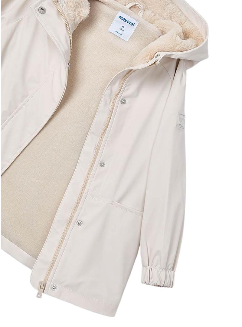 Casaco impermeável da Mayoral. Manga comprida. Cor bege. Com capuz. Fecho frontal com zíper oculto com aba. Interior macio de pelo. Bolsos na parte da frente. Tecido impermeável.