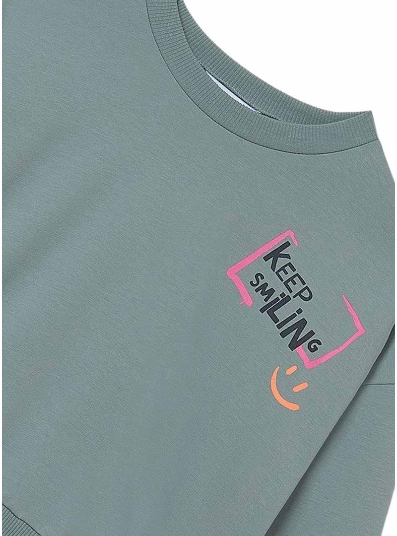 Moletom Mayoral. Cor verde. Manga comprida. Gola redonda. Ombros caídos. Corte folgado. Detalhes estampados.
