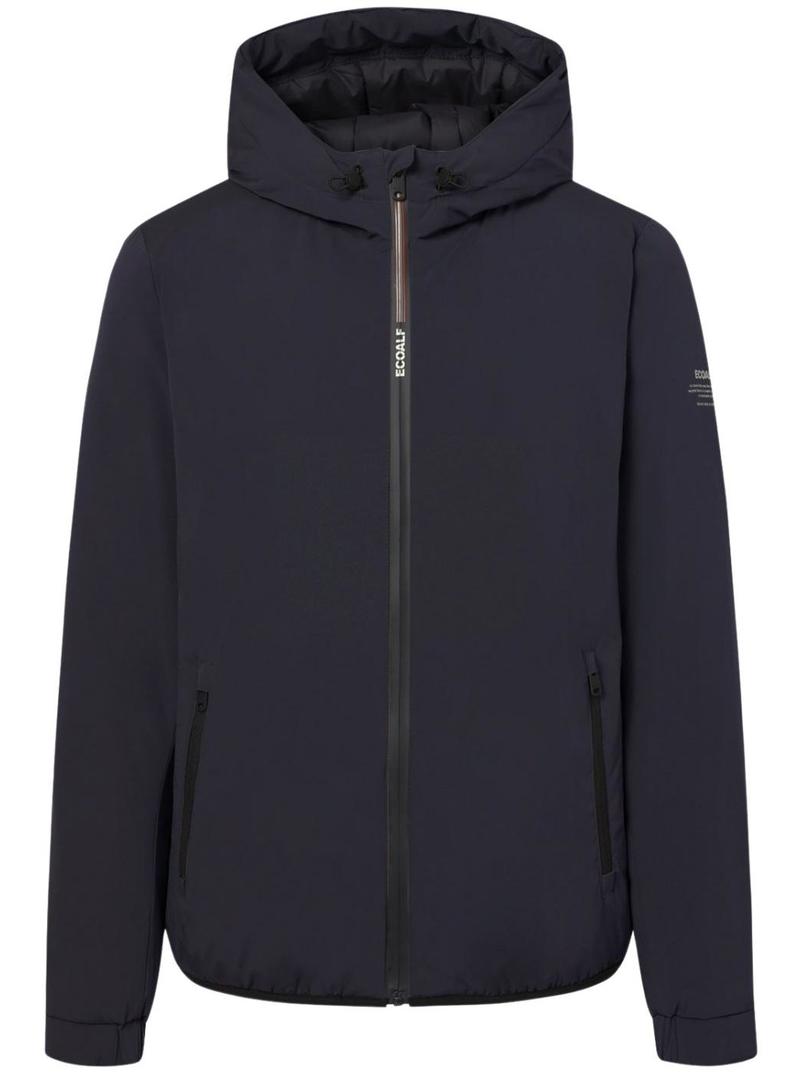 Jaqueta Ecoalf. Modelo Cartes. Cor azul marinho. Ajuste regular. Fechamento com zíper. Bolsos laterais com fecho de zíper. Capuz ajustável com cordão elástico. Bolso interno com zíper. Detalhes da marca nos puxadores. Impermeável 10k. Respirável 10k. Feito de poliéster vegano e reciclado de garrafas PET. Logo na manga.