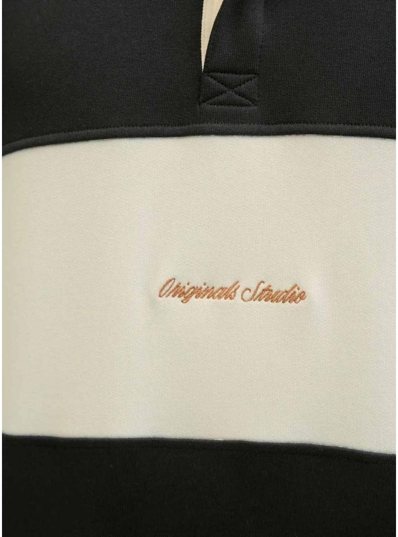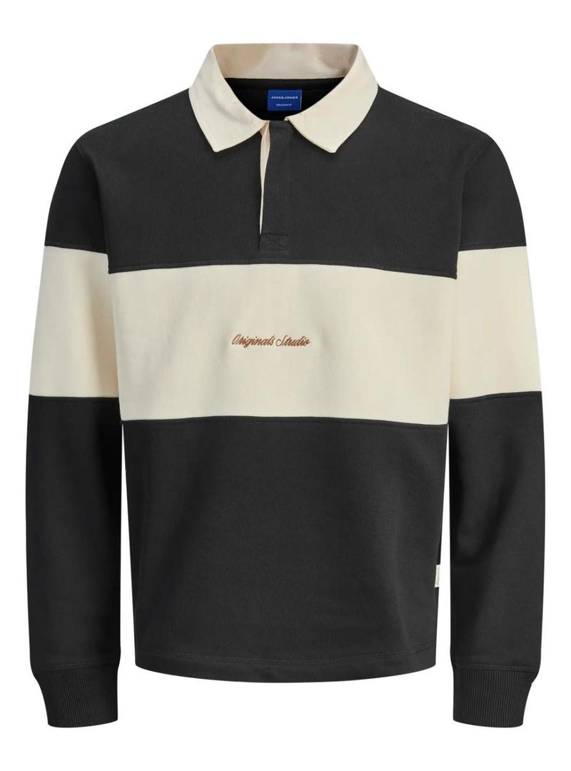 Camiseta Polo Jack and Jones. Modelo Norrebro. Cor preta e bege. Estilo rugby. Estampado com listras horizontais. Gola camisa com fecho de botões escondidos. Etiqueta lateral. Extremidades das mangas caneladas. Logotipo bordado.