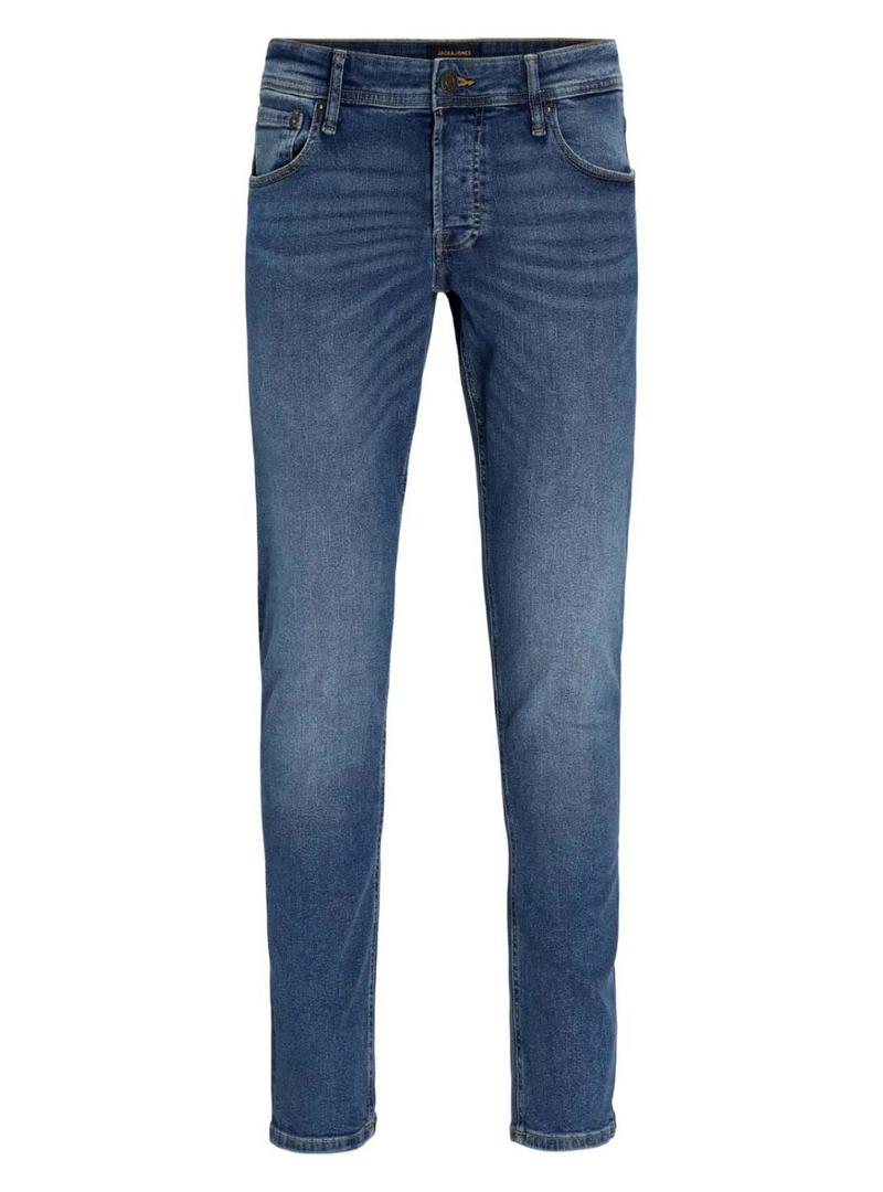 Calça jeans Jack and Jones. Modelo Glenn. Jeans médio com efeito lavado. Cintura média. Fechamento com botão e zíper. Cinco bolsos. Corte skinny. Tecido elástico.