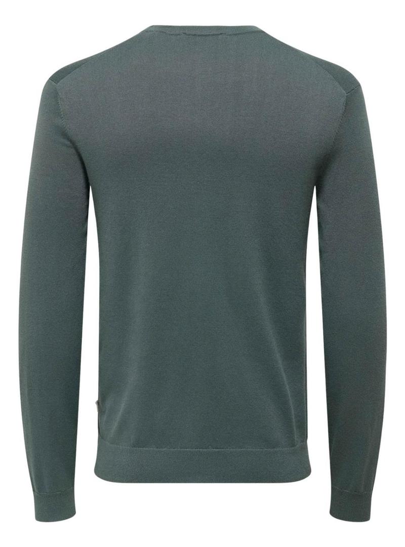 Camisola Only and Sons. Modelo Wyler. Cor verde petróleo. Gola redonda. Manga comprida. Extremidades caneladas. Corte ajustado.