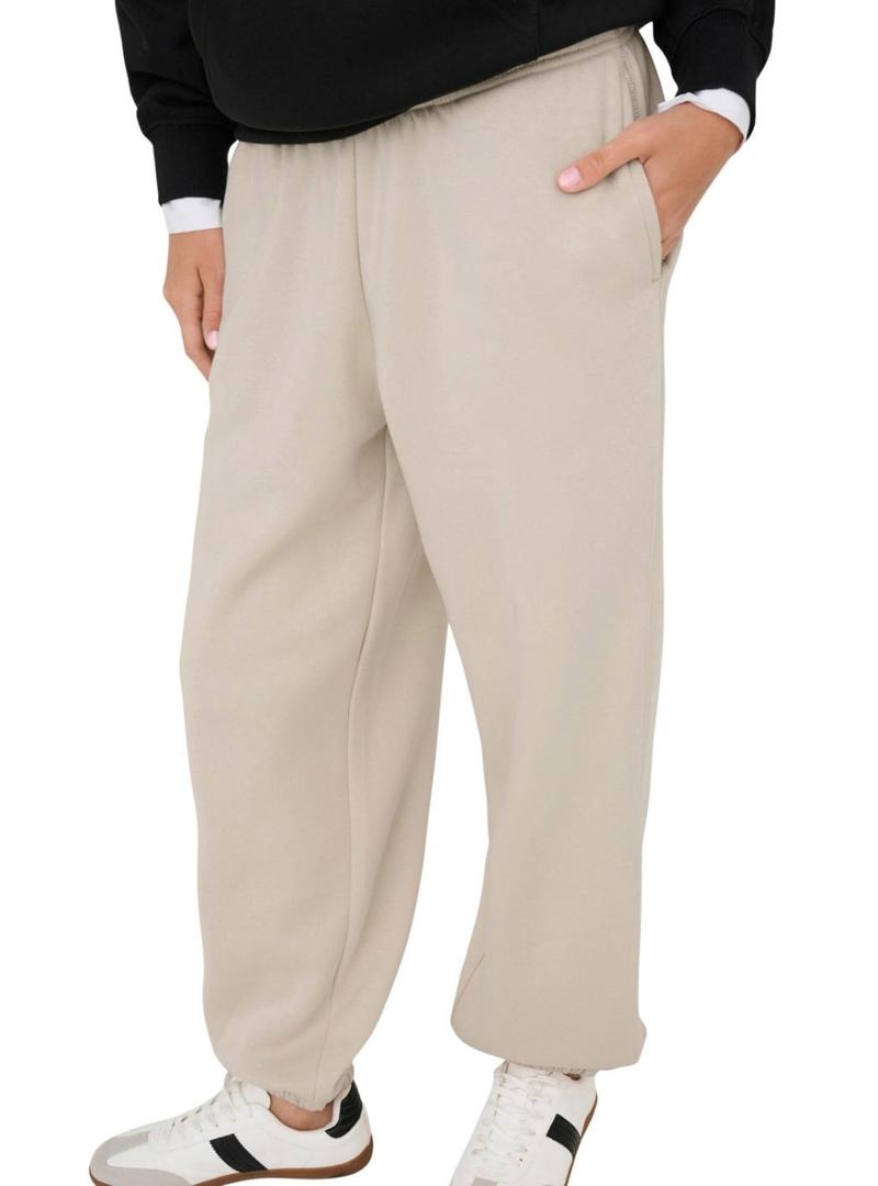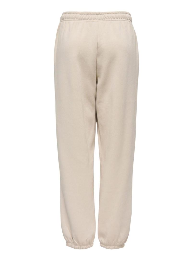 Calças Only. Modelo Best. Cor bege. Tecido mesclado. Estilo jogger. Cintura elástica. Bolsos laterais. Corte largo. Punhos elásticos na bainha.