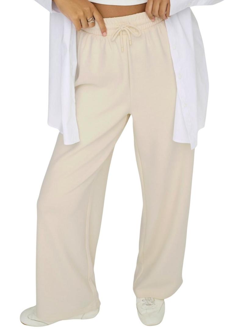 Calça Only. Modelo Scarlett. Cor bege. Cintura elástica. Corte reto. Ajuste regular. Bolsos laterais. Estilo de fato de treino.
