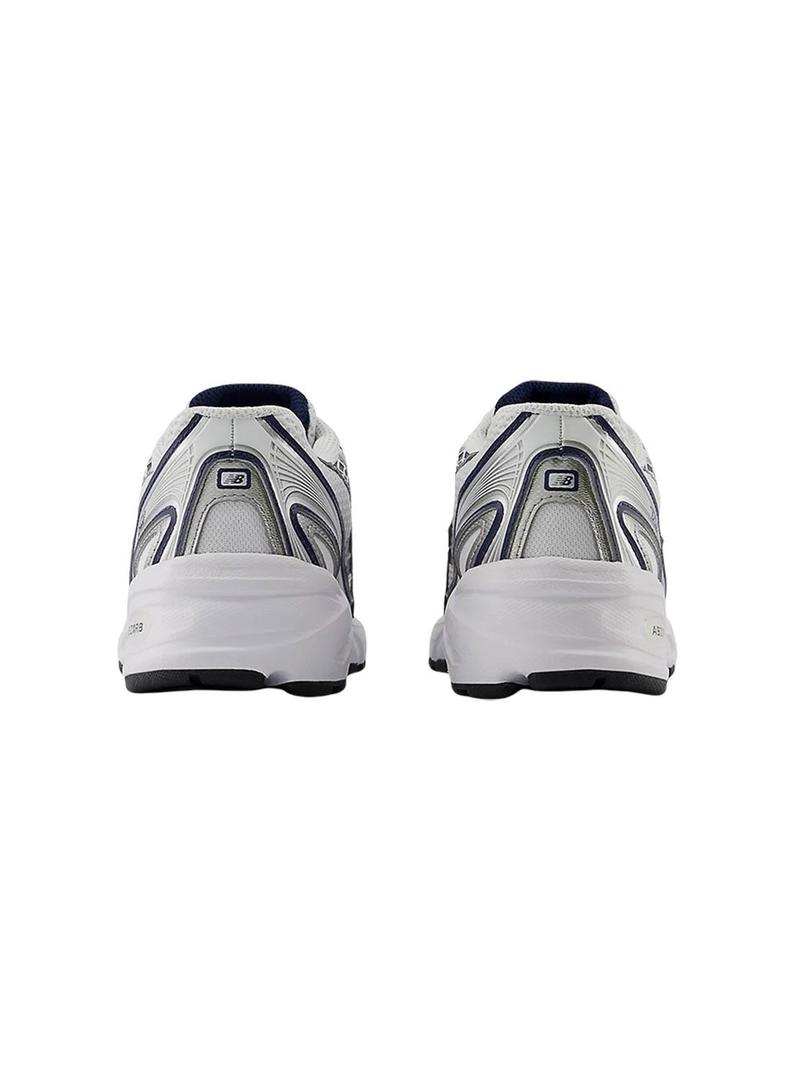 Sapatilhas New Balance. Cor branca. Detalhes em azul marinho e prateado. Modelo GR740WN. Parte superior em malha e sintético. Entressola ABZORB absorve os impactos.