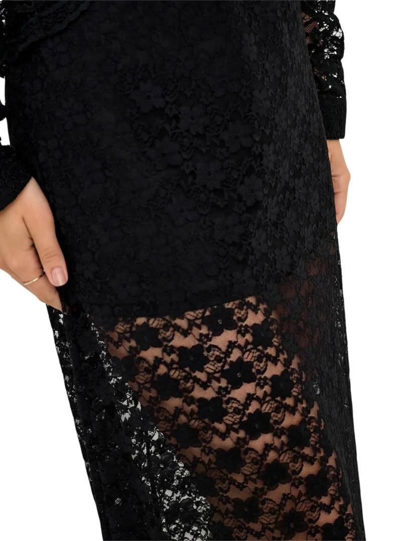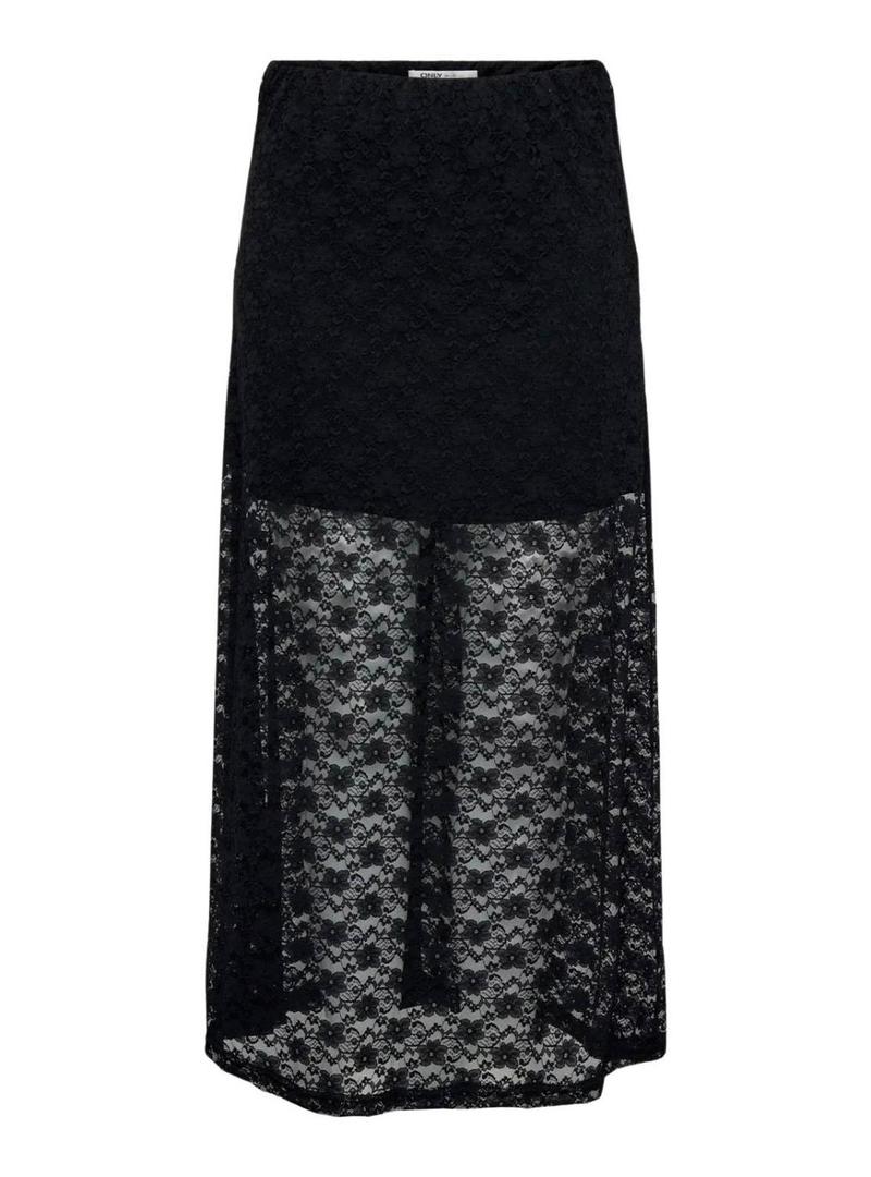Saia Only. Modelo Chigo. Cor preta. Cintura elástica. Tecido de renda. Forro interior curto. Comprimento midi.
