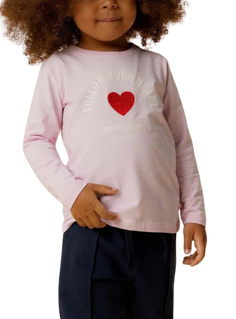 Camiseta Name It. Cor de rosa. Manga comprida. Gola redonda. Estampado na frente. Detalhe de coração em contraste.