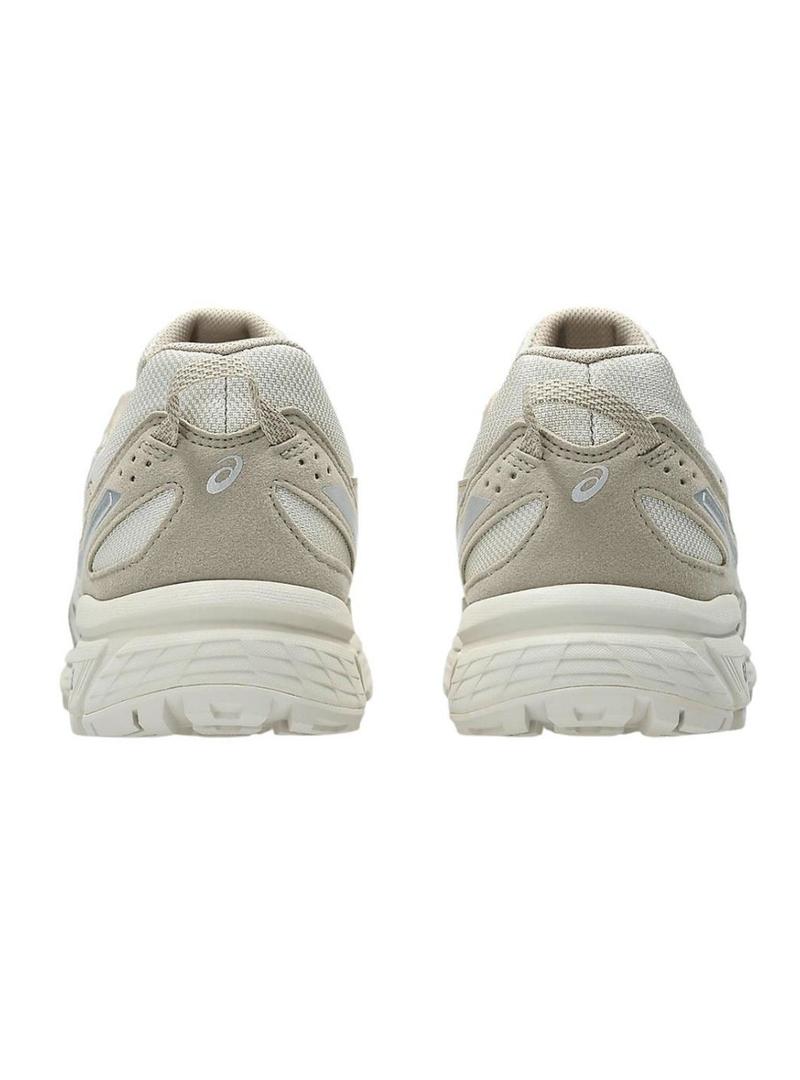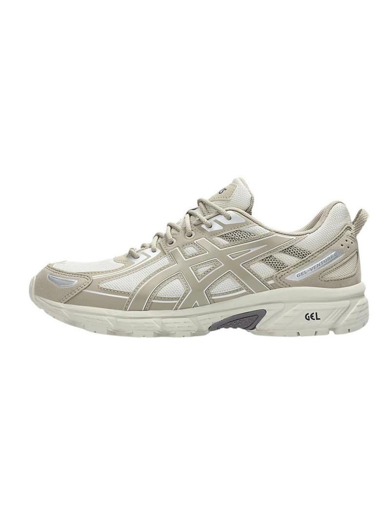 Sapatilhas Asics. Modelo Gel Venture 6. Cor bege. Encerramento com cordões. Sola de gel para melhor amortecimento. Painéis de malha. Logotipo lateral. Modelo estampado. Estilo retro.