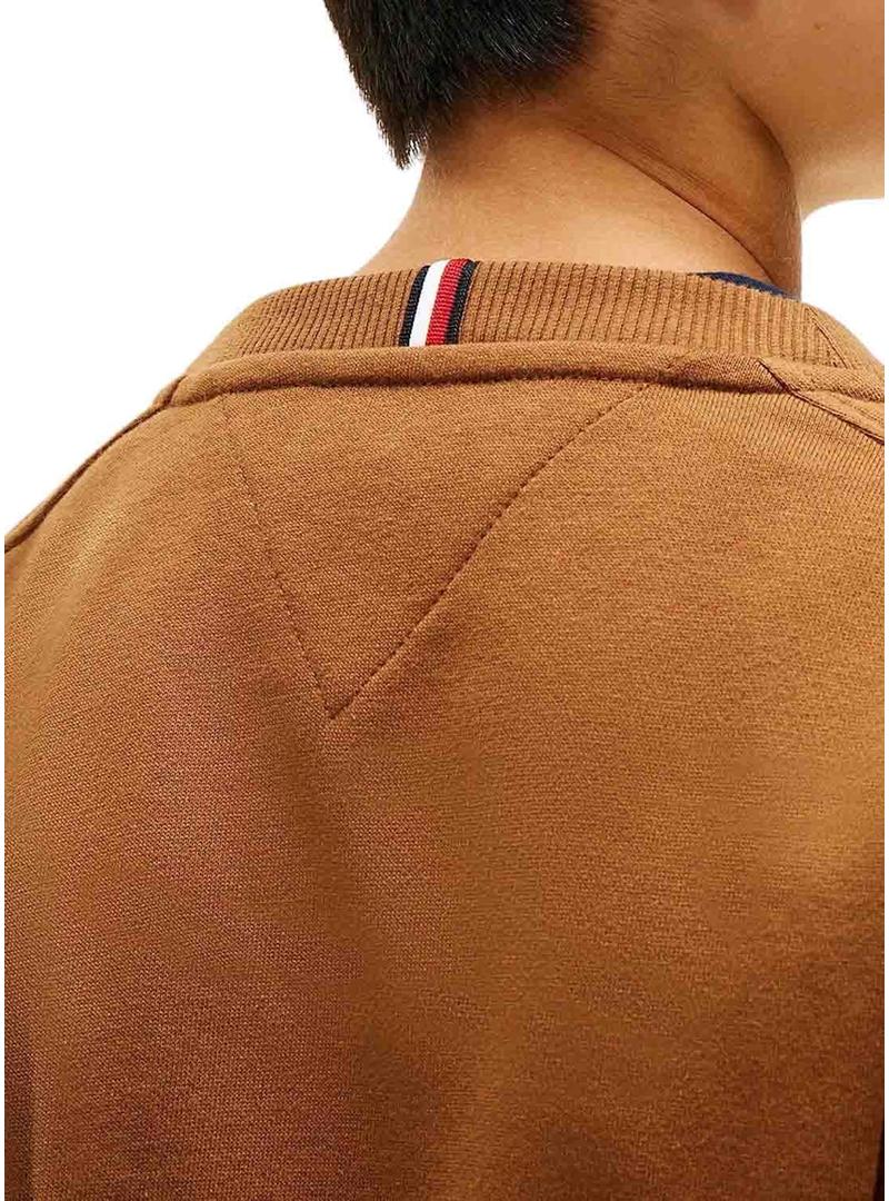 Moletom Tommy Hilfiger. Cor marrom. Gola redonda. Manga comprida. Logo estampado texturizado no peito. Bandeira bordada em uma manga. Corte regular. Mangas raglã.