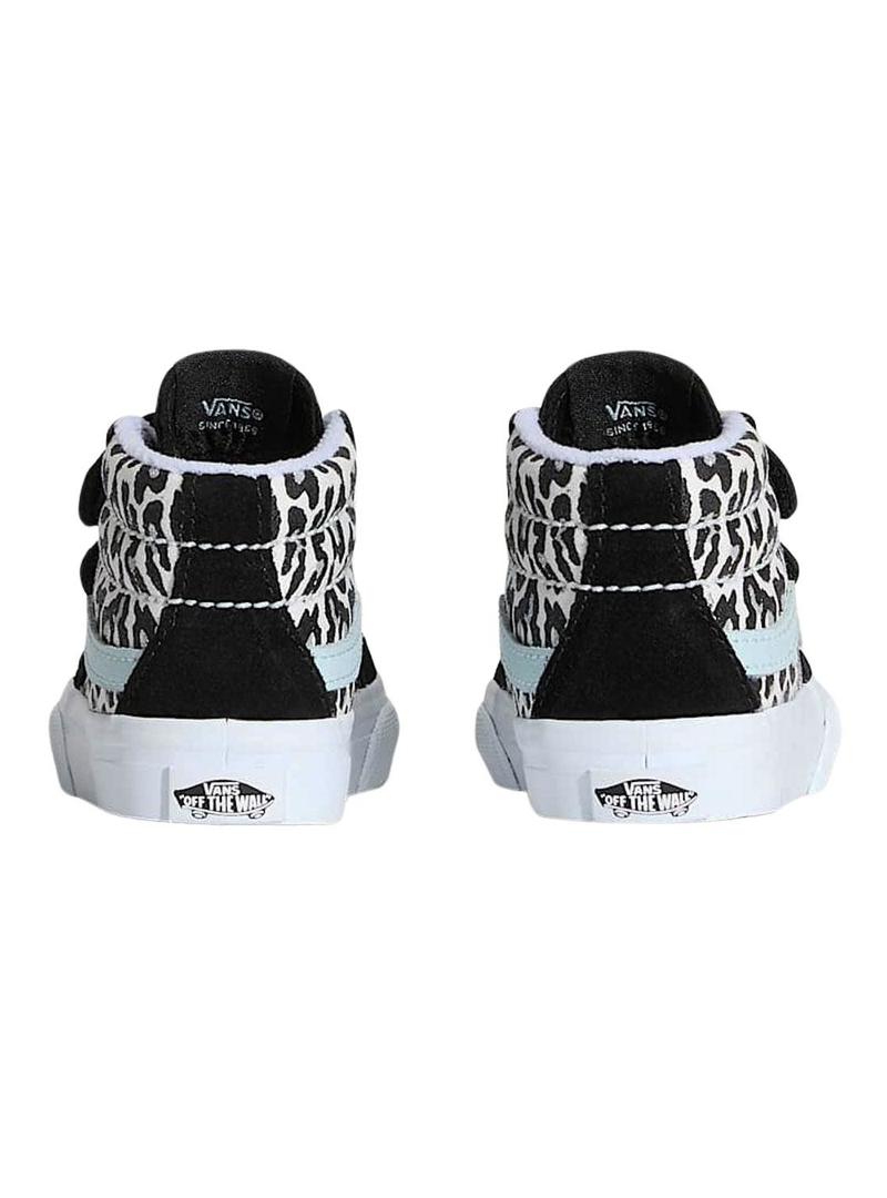 Tênis Vans. Modelo Sk8 Mid. Cor preta. Estampa de leopardo. Fechamento com duas tiras de velcro. Cabedal resistente de couro. Pontas reforçadas. Gola acolchoada. Sola de borracha waffle. Sidestripe em azul.
