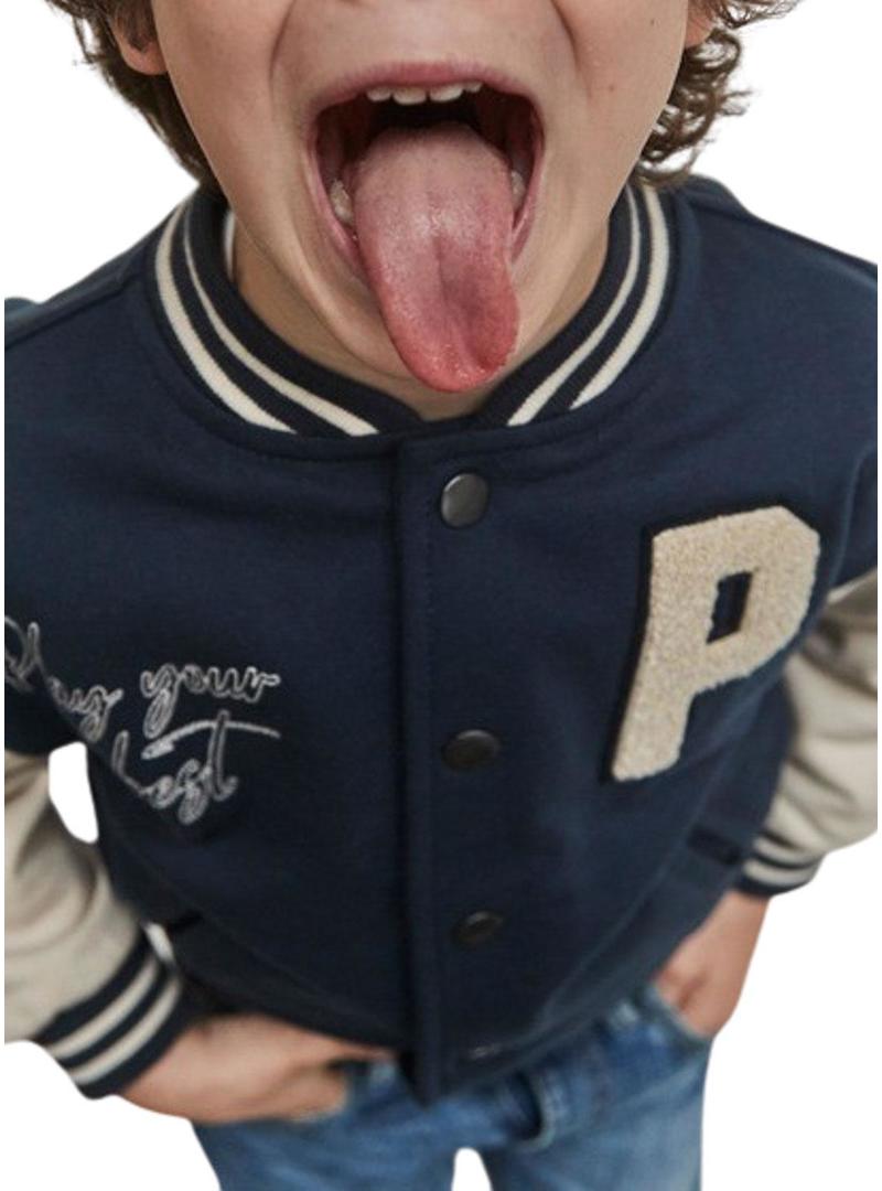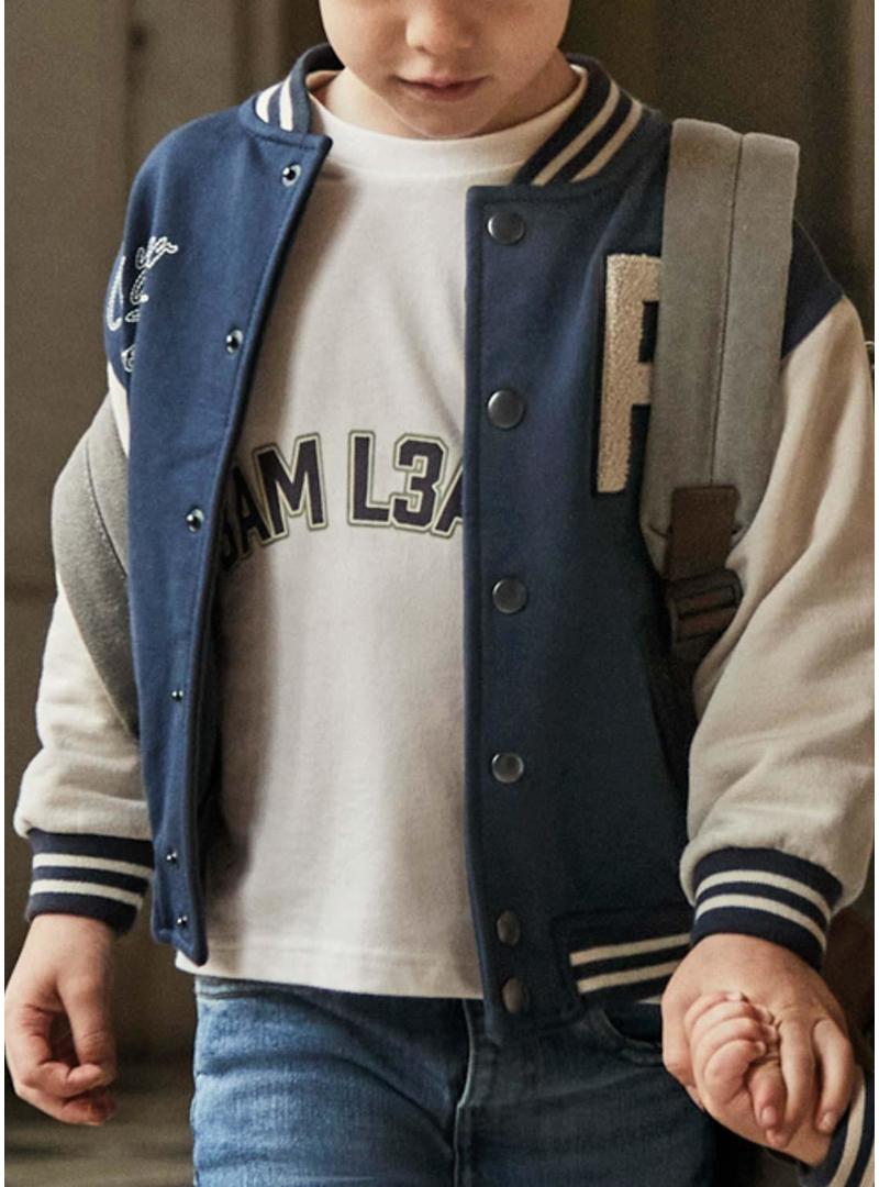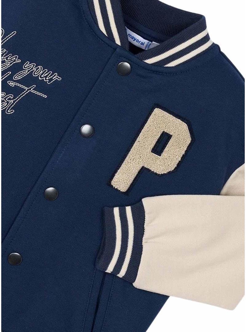 Bomber Mayoral. Cor azul. Acabamentos canelados. Mangas em contraste. Detalhe de listras. Bordados na parte da frente. Fechamento com botões de pressão. Bolsos frontais.