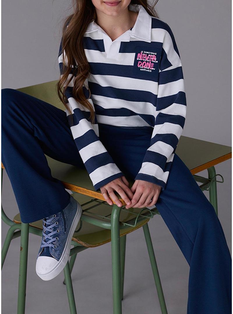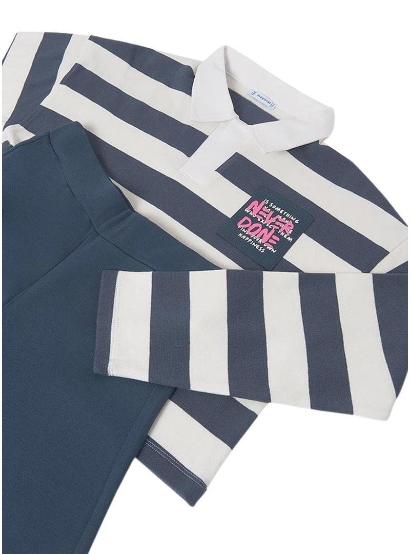 Conjunto Mayoral. Polo com estampa de listras. Bordado no peito. Manga comprida. Corte folgado. Calça azul. Formato longo. Cintura de elástico. Perna larga.