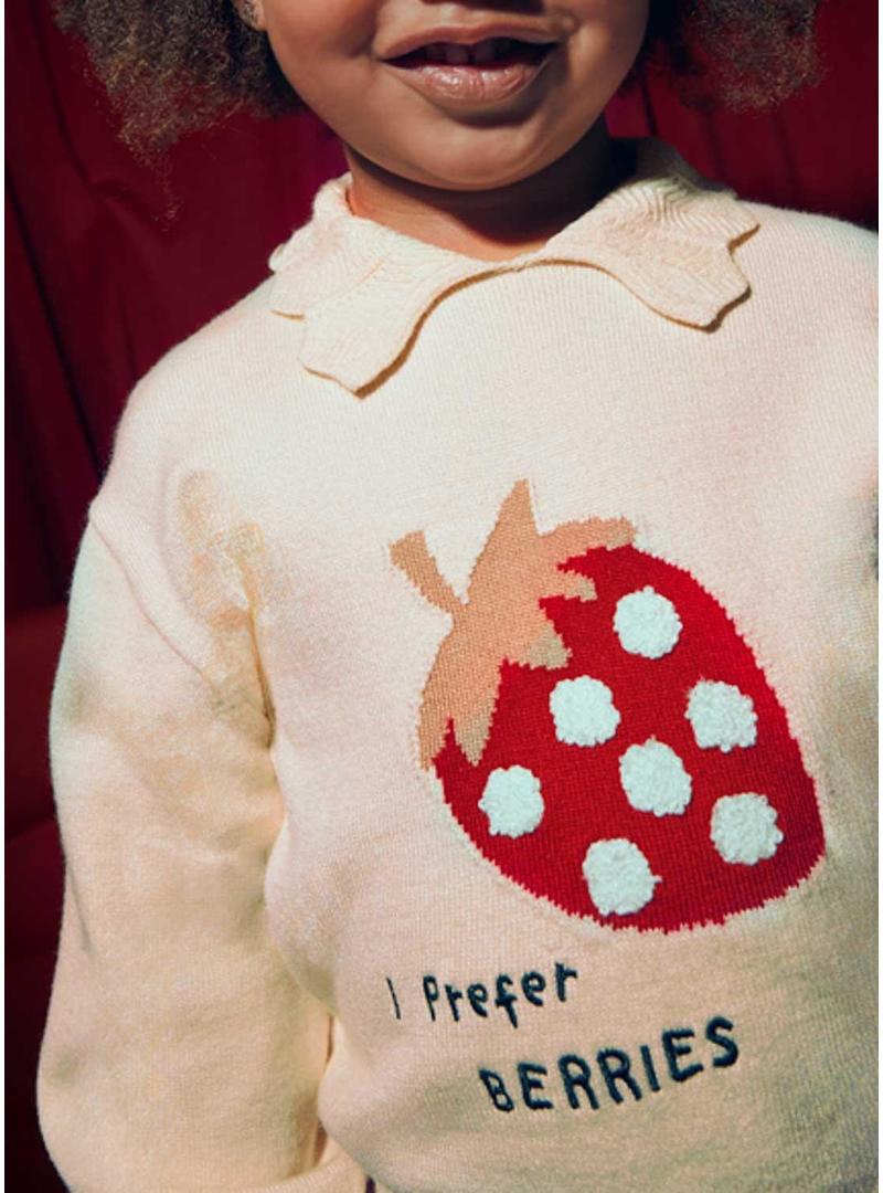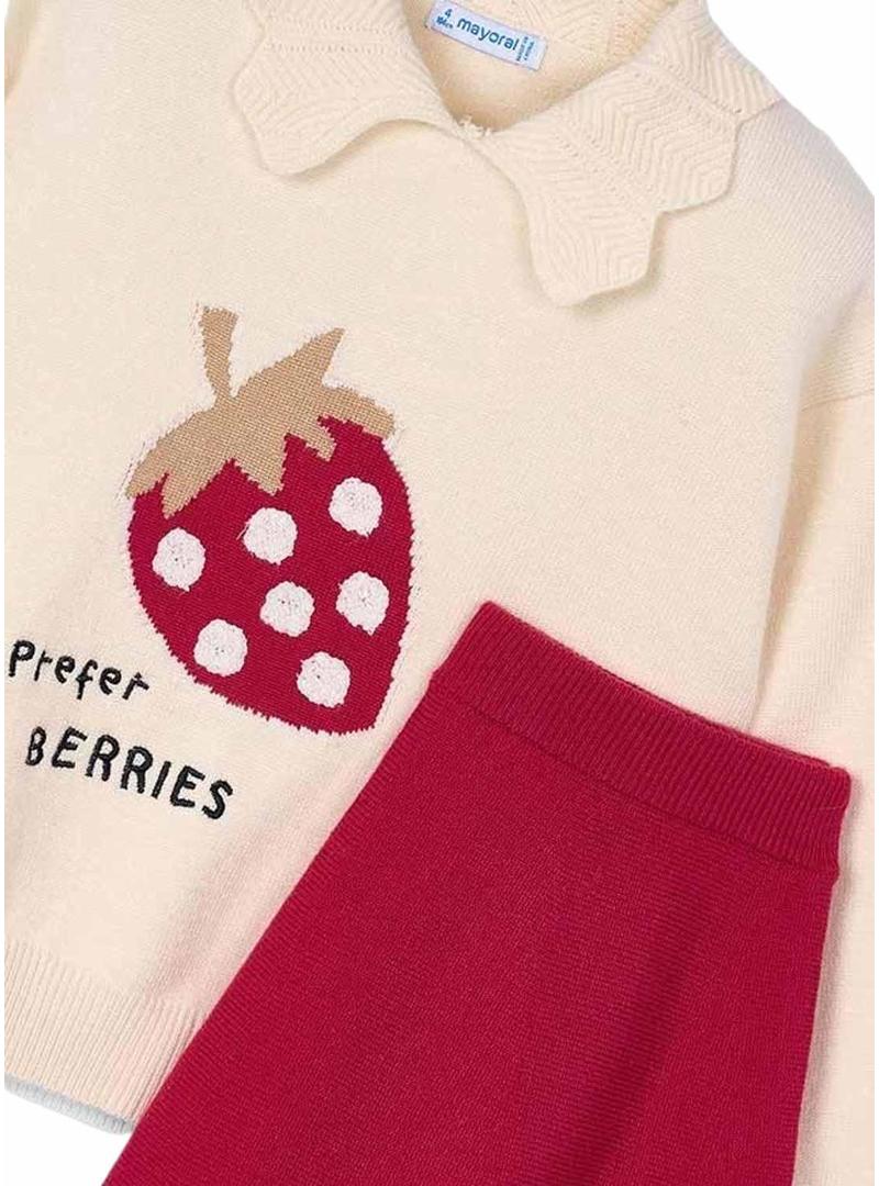 Camisola Mayoral. Gola de bebê. Banda elástica na barra. Morango com estampa intarsia. Detalhes bordados. Manga comprida. Saia de malha. Cor vermelha. Cintura elástica. Comprimento curto.