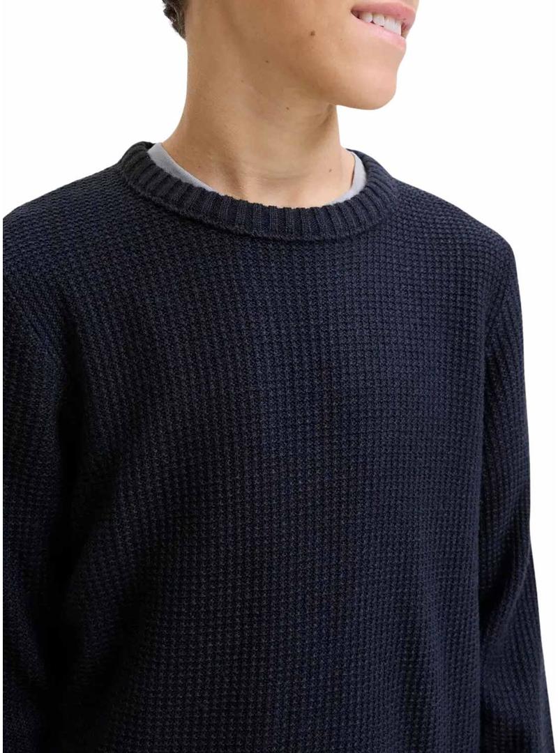 Jersey Jack and Jones. Cor azul marinho. Tecido de malha estruturada. Gola redonda. Manga comprida. Acabamentos canelados.