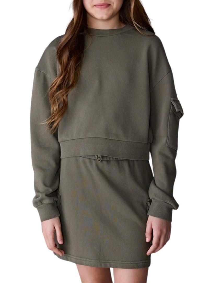 Conjunto Mayoral. Cor verde. Saia cargo. Cintura elástica ajustável. Bolsos laterais. Moletom com gola redonda. Manga comprida. Bolso com aba em uma manga.