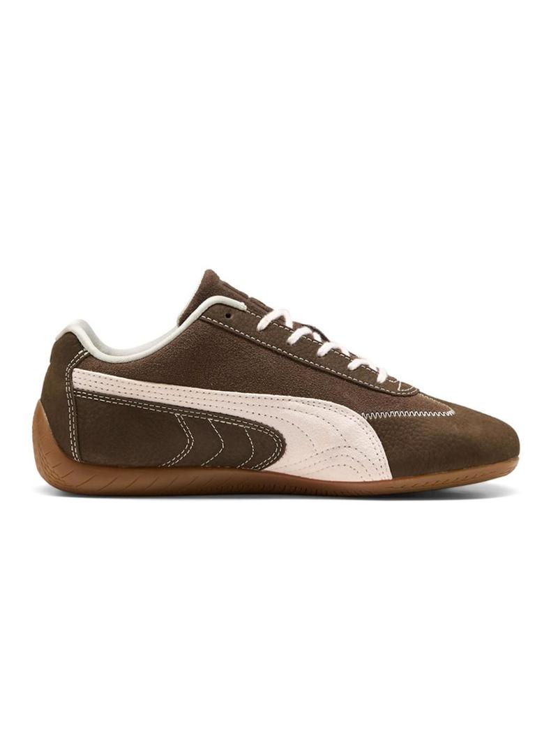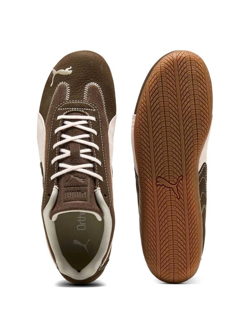 Sapatilhas Puma. Cor marrom. Silhueta baixa. Parte superior em couro premium. Fecho com cadarços. Forro de malha. Sola de borracha fina. Biqueira redonda. Inspiradas no mundo do automobilismo. Faixa característica PUMA de camurça. Gato PUMA bordado na biqueira. Detalhes em bege.
