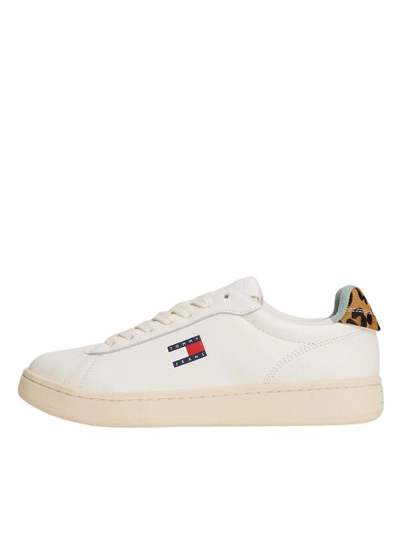 Sapatilhas Tommy Jeans. Modelo Archive 98 Leopard. Cor branca. Calcanhar estampado com animal print. Fecho com cordões. Logotipo lateral. Sola de borracha.