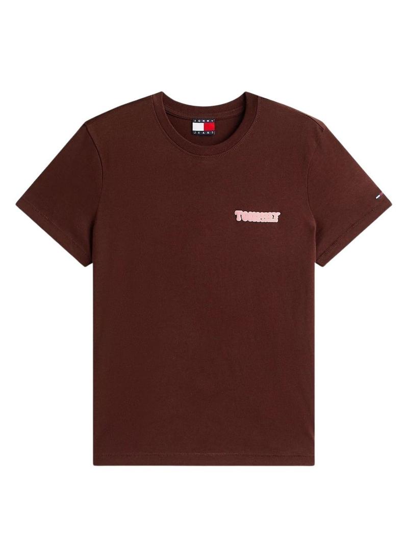 Camiseta Tommy Jeans. Modelo Vintage. Cor marrom. Gola redonda. Manga curta. Corte quadrado. Marca estampada no peito. Mensagem estampada nas costas. Detalhes em rosa.