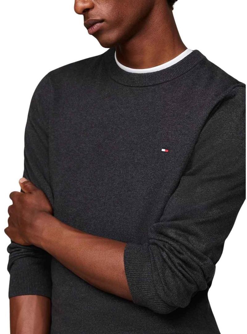 Camisola Tommy Hilfiger. Modelo Cashmere. Cor cinza escuro. Gola redonda. Manga comprida. Extremidades caneladas. Ajuste regular. Logotipo bordado no peito. Tecido com uma percentagem de cashmere que proporciona maciez.