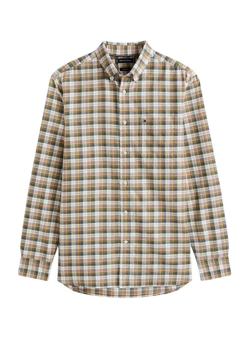 Camisa Tommy Hilfiger. Modelo Heritage Oxford. Cor bege, verde e amarelo. Estampa tartan. Fechamento com botões. Logotipo bordado no peito. Ajuste regular. Gola com botões.