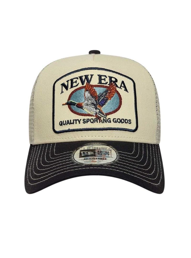 Boné New Era. Modelo Animal Patch. Estilo Trucker. Cor bege. Viseira curvada em preto com costuras em contraste. Logotipo bordado na parte da frente com ilustração animal. Parte traseira em tela. Fecho ajustável na parte de trás.