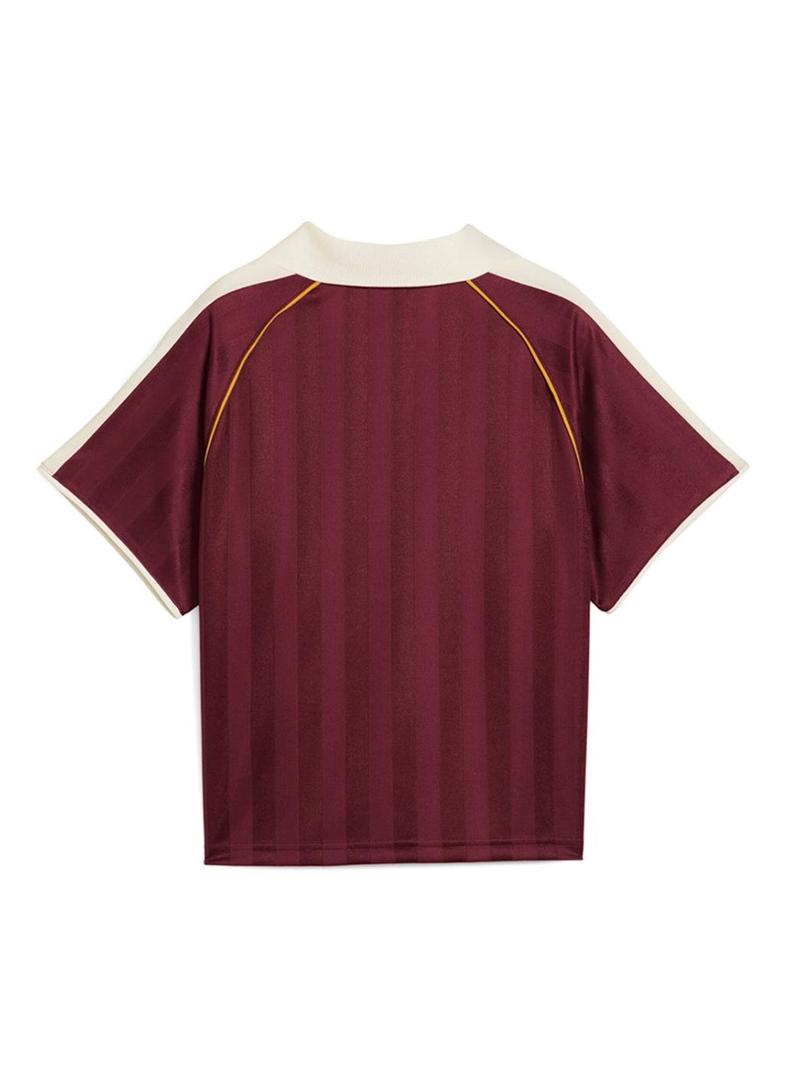 Camiseta Puma. Cor granada. Corte folgado. Gola de polo. Decote em V. Manga curta. Bandas distintivas da Puma. Logo no peito.