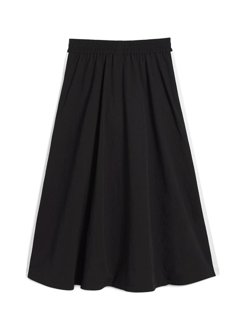 Saia Puma. Cor preta. Cintura de elástico ajustável com cordões. Tecido de nylon. Bolsos laterais com zíper. Comprimento abaixo do joelho. Listras PUMA T7 nas laterais. Logo branco na parte da frente.