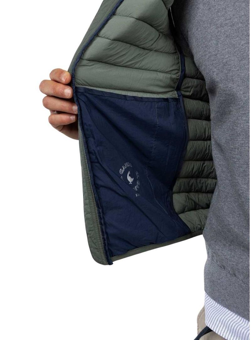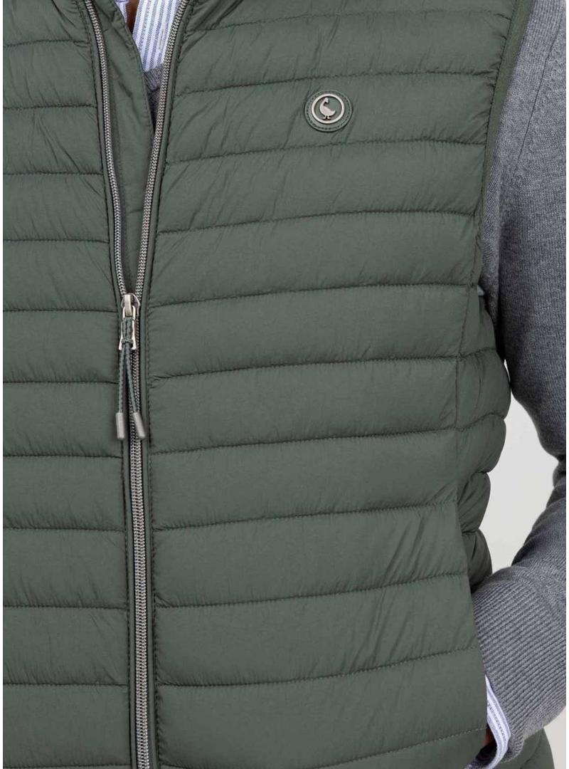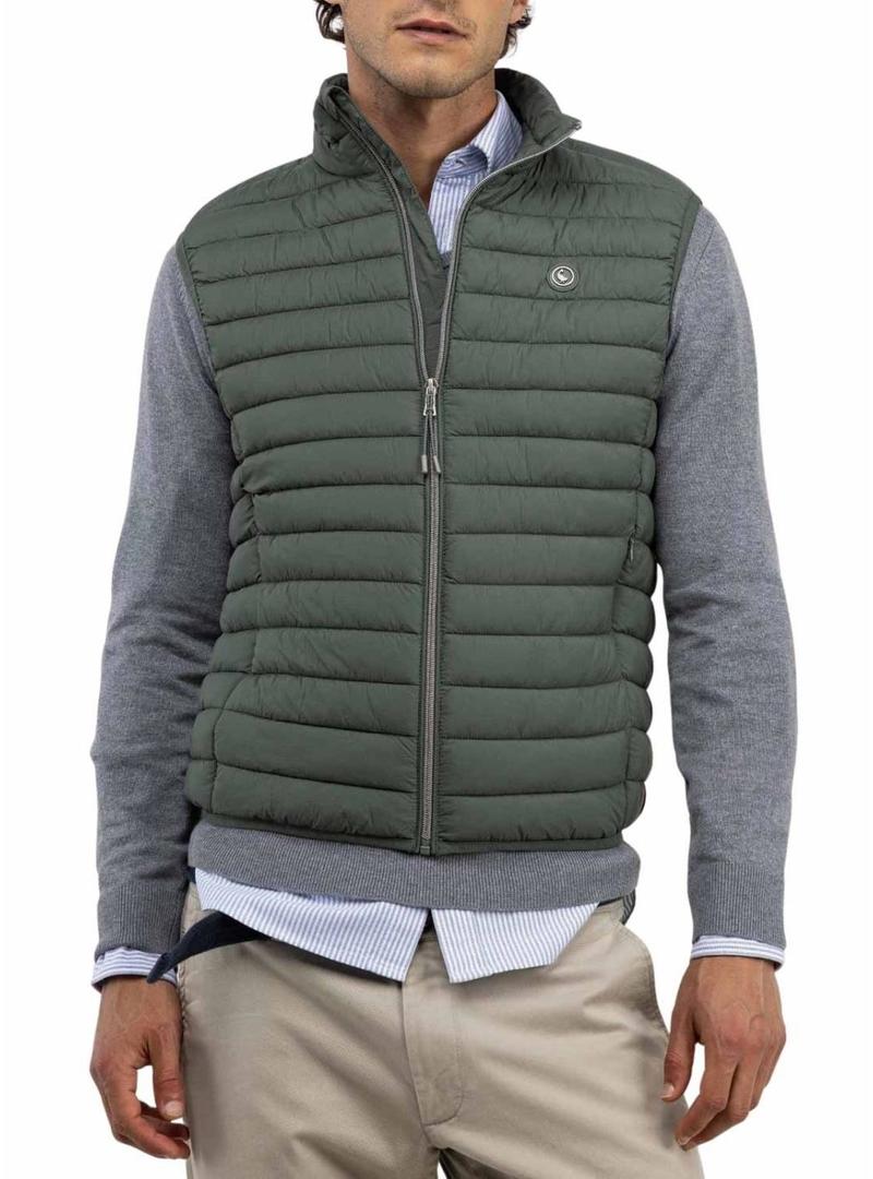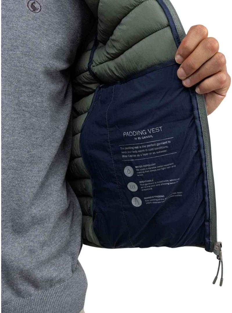 Colete El Ganso. Modelo acolchoado básico. Cor verde. Gola alta. Fecho com zíper. Logotipo em relevo no peito. Bolsos laterais. Acolchoado leve. Resistente à água.