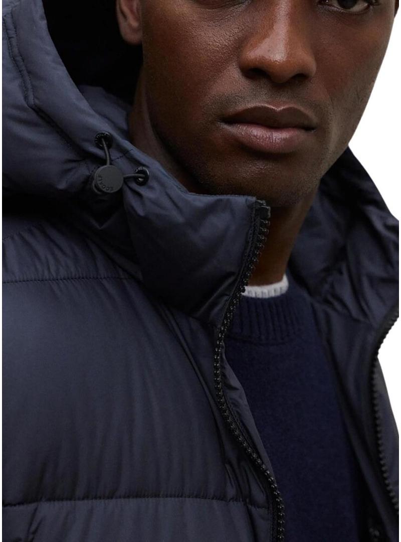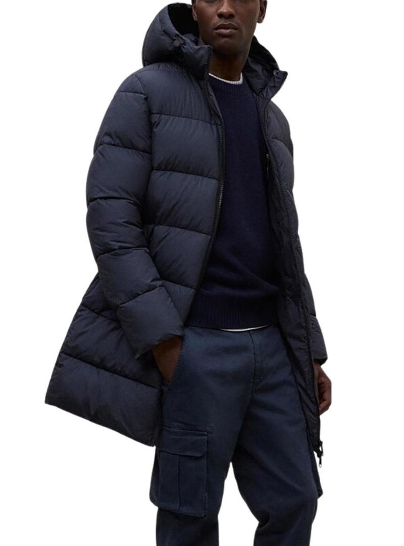 Casaco Ecoalf. Modelo Vintage. Cor azul marinho. Tecido acolchoado. Confeccionado com 100% poliéster reciclado obtido de garrafas de plástico recicladas. Fecho com zíper. Gola alta. Capuz ajustável com elástico. Bolsos laterais com zíper. Patch da marca na manga. Muito leve. Vegano. Livre de PFCs. Resistente à água.