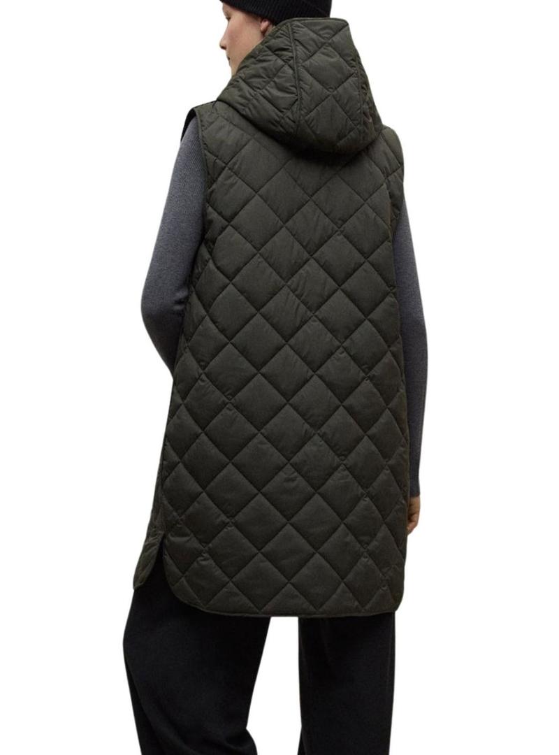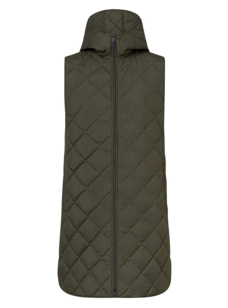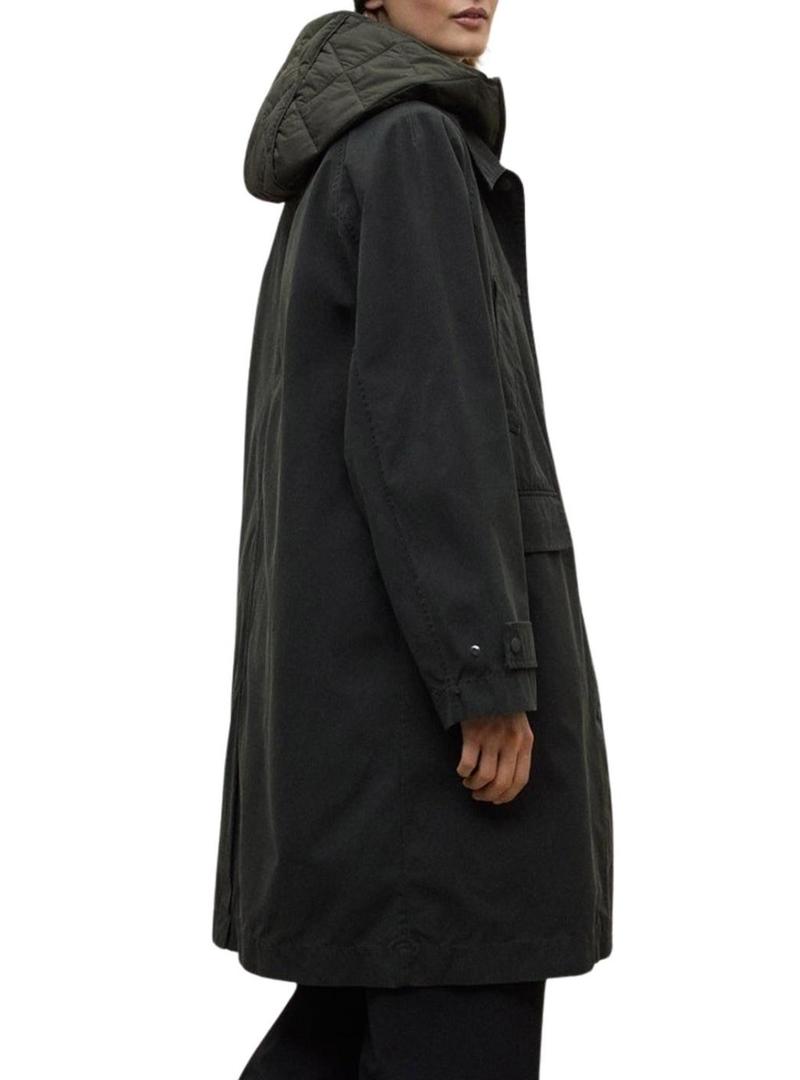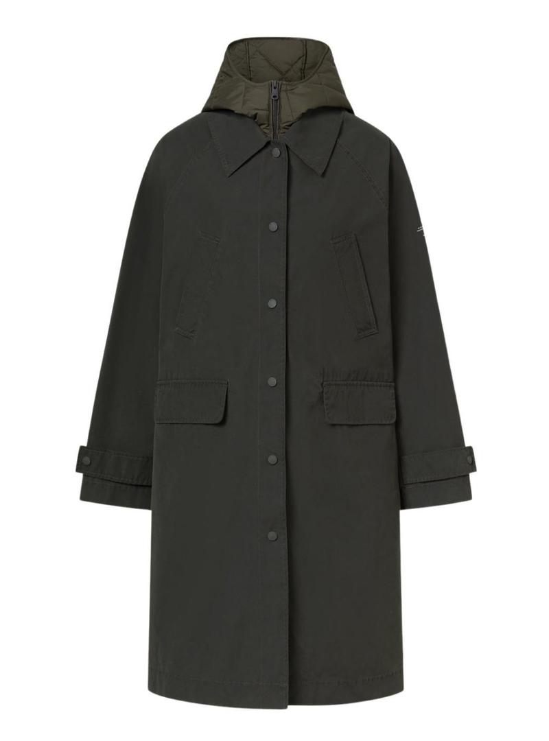 Casaco Ecoalf Hyden. Cor verde. Corte folgado. Comprimento acima do joelho. Fecho com botões. Gola camiseira. Bolsos com aba na cintura. Bolsos no peito. Punhos ajustáveis. Abertura traseira. Colete interior com ajuste regular. Gola alta com capuz. Tecido acolchoado geométrico. Resistente à água. Produto vegano. Sustentável.