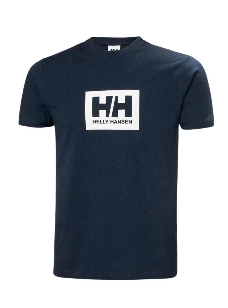 Camiseta Helly Hansen. Modelo Box. Cor azul marinho. Gola redonda. Manga curta. Logo estampado no peito. Ajuste regular. Detalhes em contraste branco.