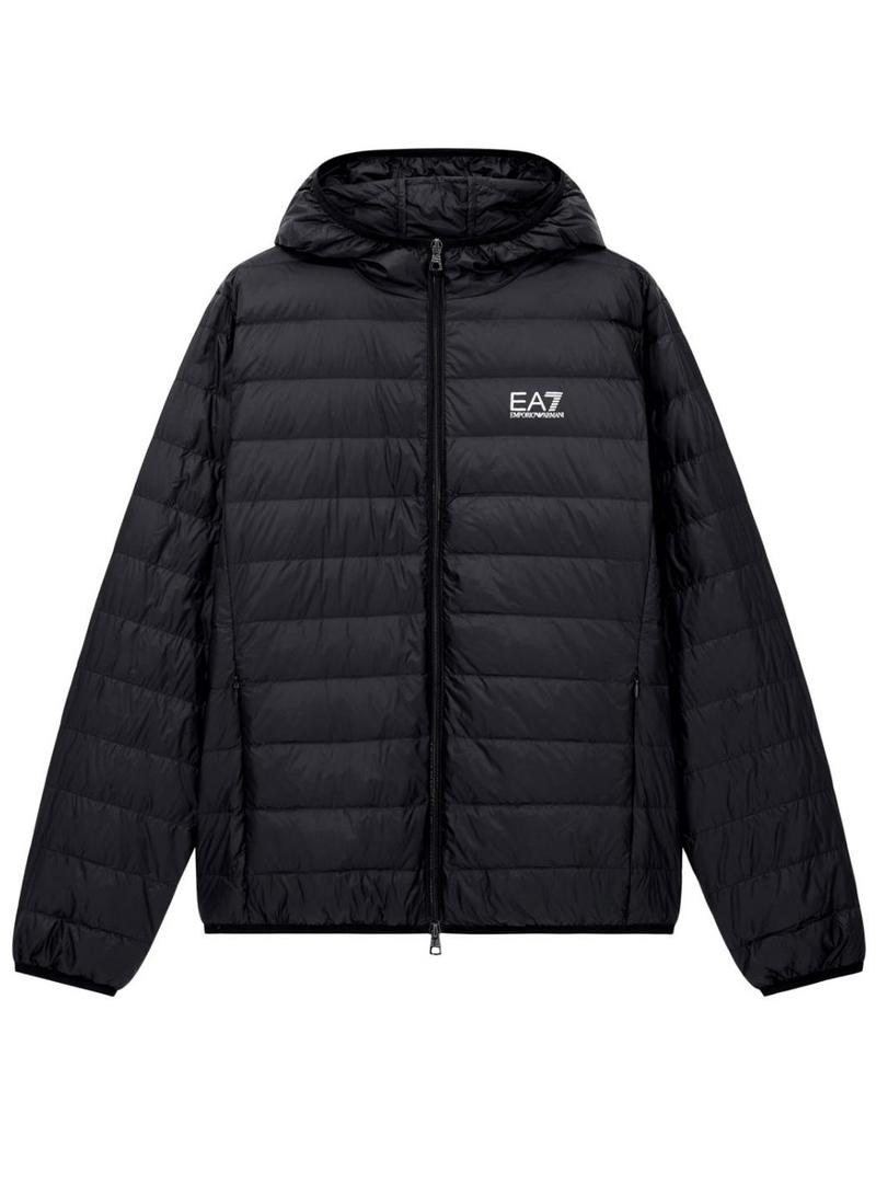 Casaco Emporio Armani EA7. Modelo Tecido. Cor preta. Acolchoado com penas de ganso. Modelo dobrável com bolsa. Capuz fixo. Fecho frontal com zíper. Dois bolsos laterais com zíper. Logotipo EA7 em destaque no peito.