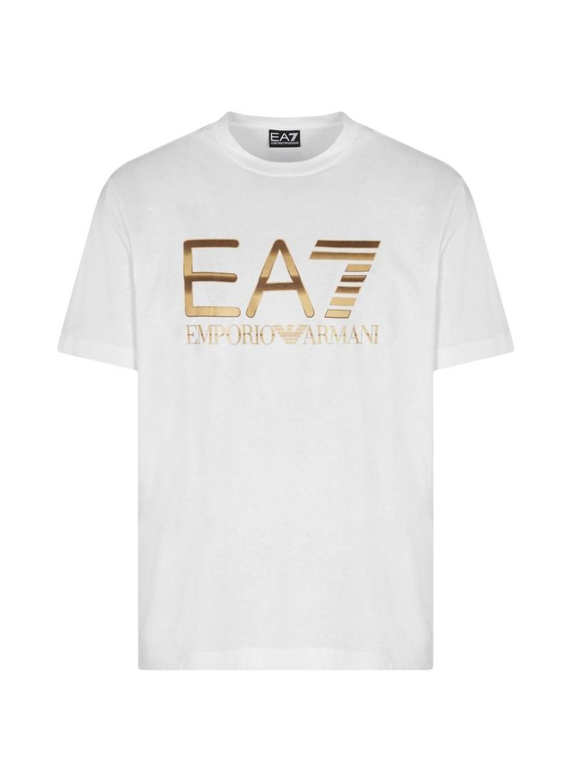 Camiseta Emporio Armani EA7. Cor branca. Modelo básico. Gola redonda. Extremidades caneladas. Ajuste regular. Logotipo estampado no peito em dourado em relevo.