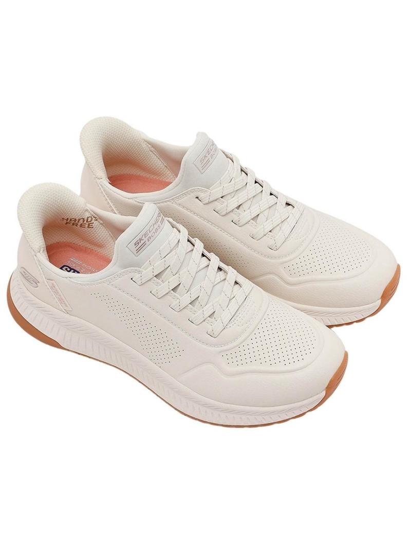 Sapatilhas Skechers. Modelo Bobs Squad 4. Cor branca. Parte superior em couro vegano com cordões elásticos. Slip on. Palmilha com amortecimento. Logotipo lateral. Muito leves.
