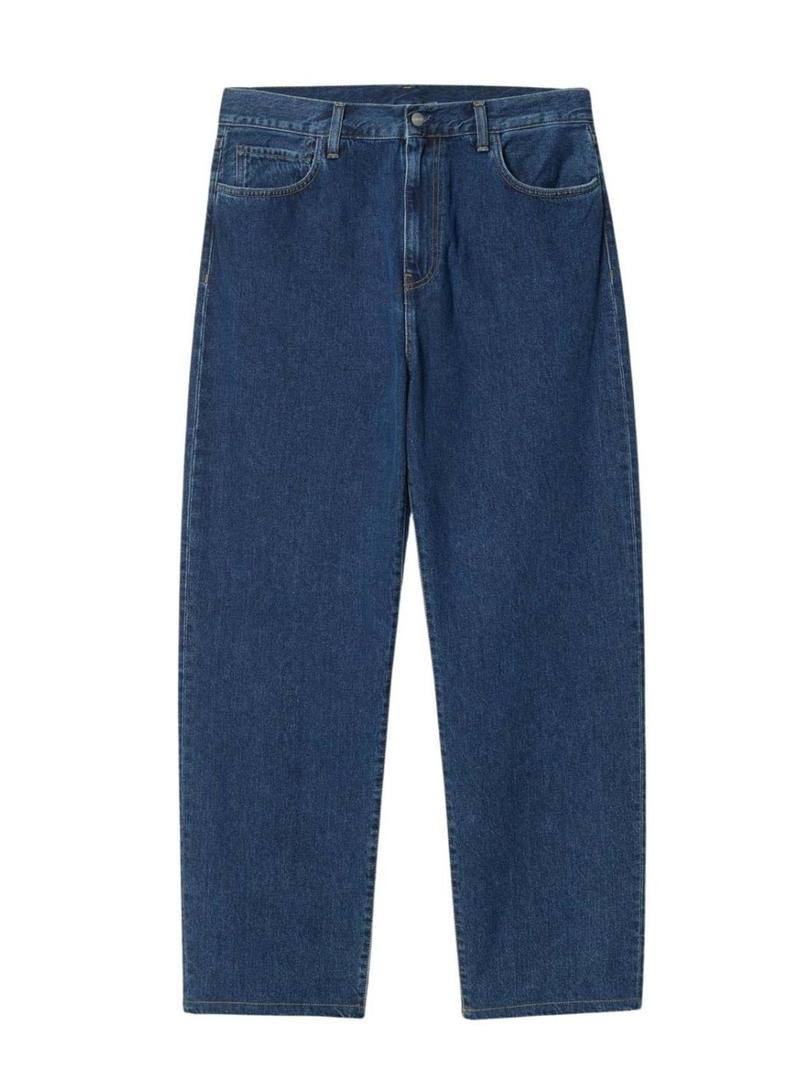 Calças de ganga Carhartt. Modelo Landon. Cor azul. Fecho de botão e fecho éclair. Costuras em contraste. Bolsos laterais. Bolsos traseiros com emblema da marca. Ajuste folgado. Corte reto.