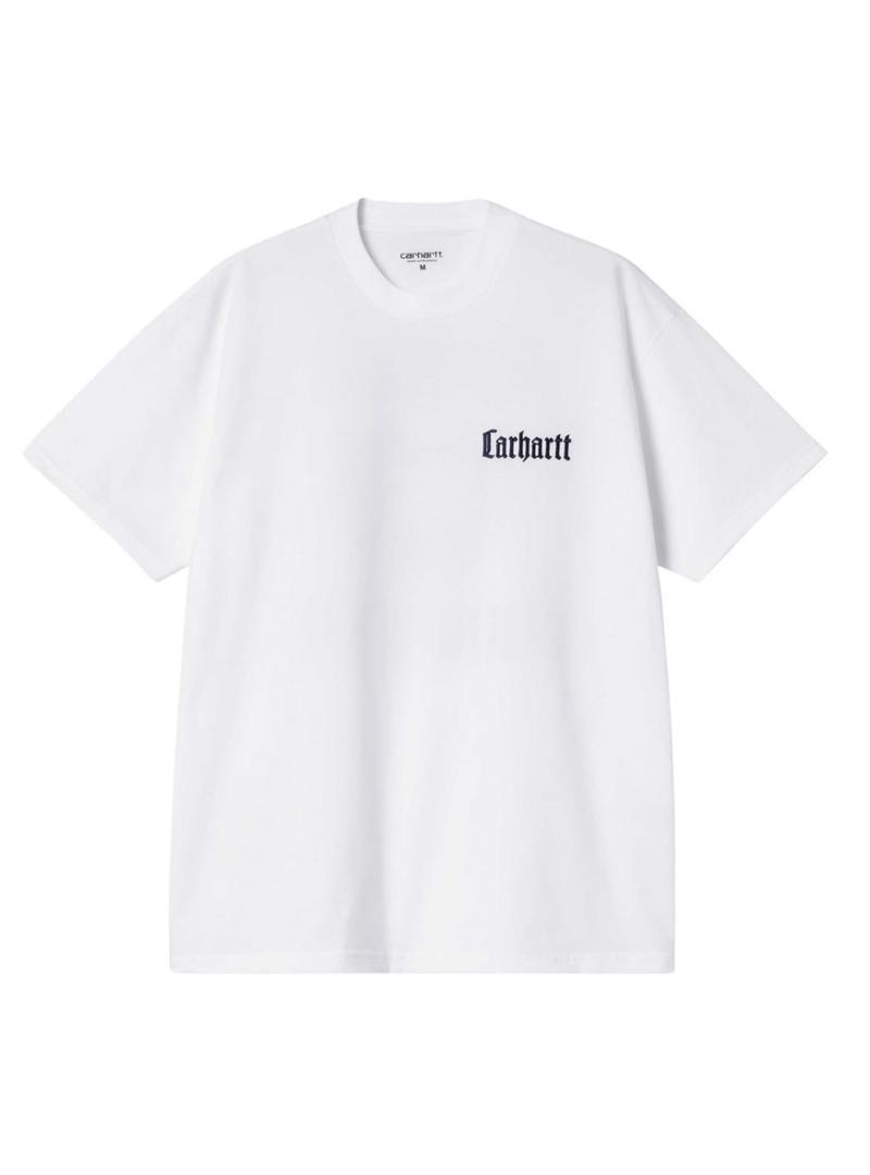 Camiseta Carhartt. Modelo Schooling. Cor branca. Gola redonda. Manga curta. Ajuste folgado. Marca no peito. Ilustração da Universidade estampada nas costas.