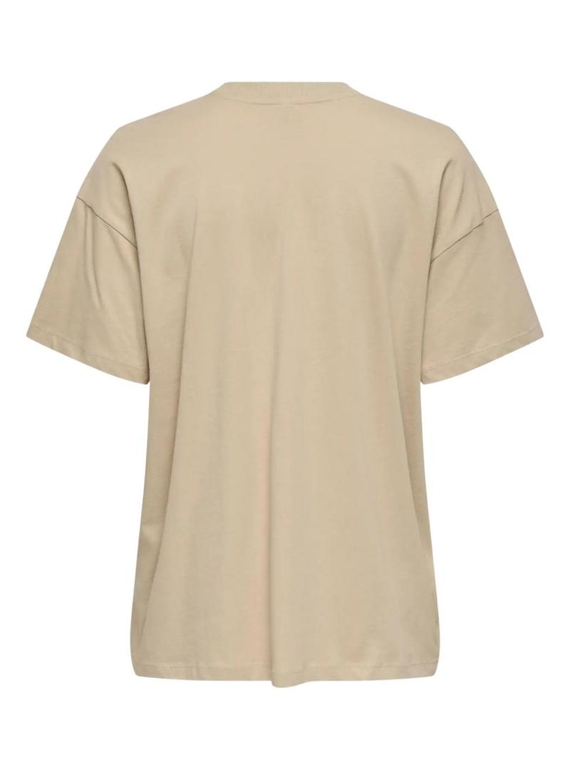 Camiseta Only. Modelo Vivvi. Cor bege. Manga curta. Gola redonda. Ilustração de café estampada na frente. Ajuste folgado.