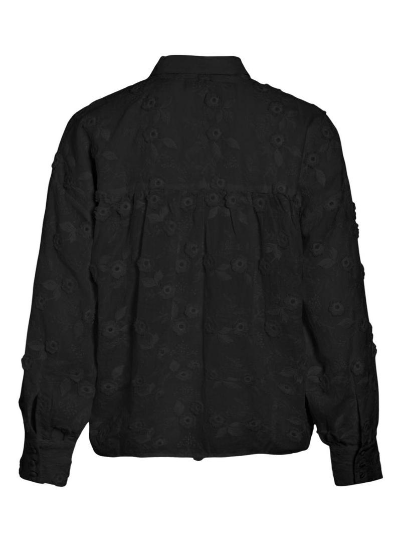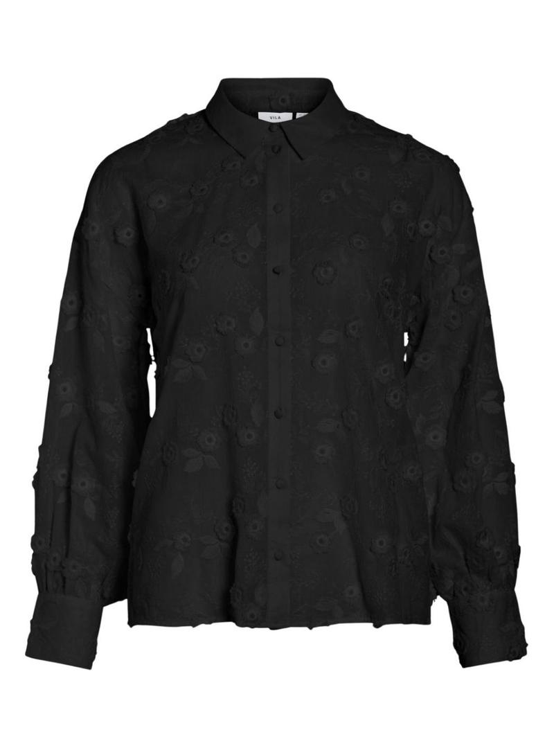 Camisa Vila. Modelo Visimone. Cor preta. Tecido com flores bordadas combinando. Ajuste regular. Manga com leve volume. Fechamento com botões combinando.