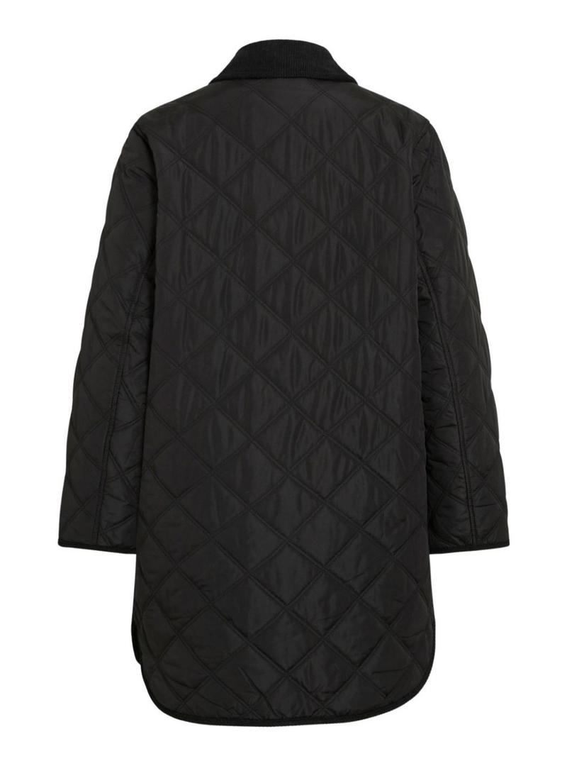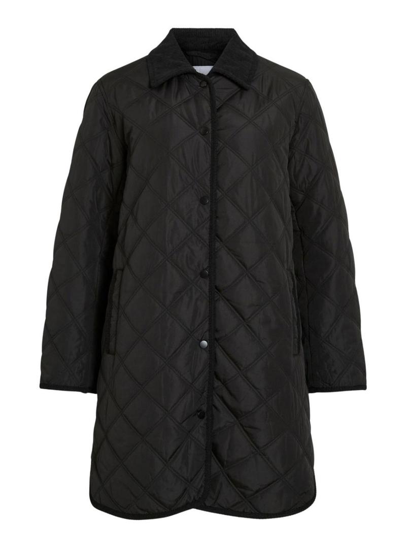 Parka Vila. Modelo Viquila. Cor preta. Fechamento com botões de pressão. Gola em tecido de veludo contrastante. Bolsos laterais. Acolchoado leve em forma de diamante. Comprimento até os joelhos.