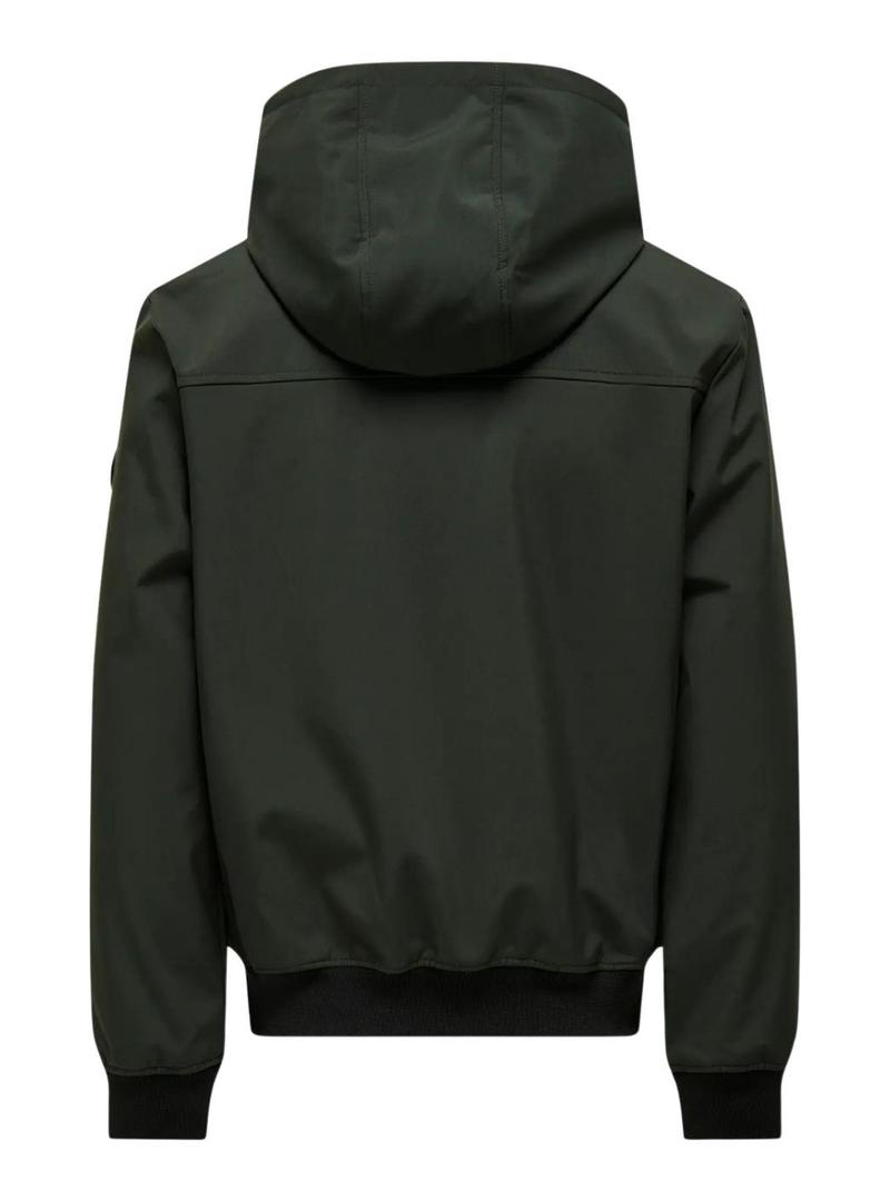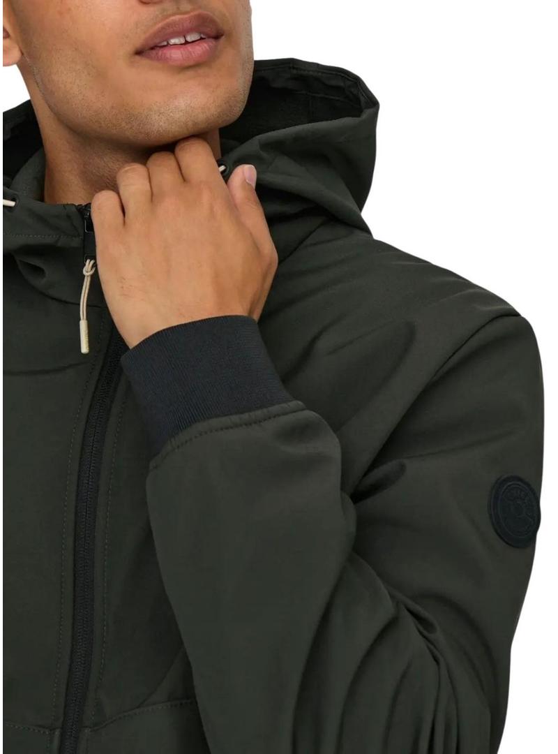 Casaco Only and Sons. Modelo Bowie. Cor preta. Tecido softshell. Fecho com fecho de correr. Gola alta com capuz. Bolsos laterais. Extremidades elásticas caneladas. Ajuste regular.