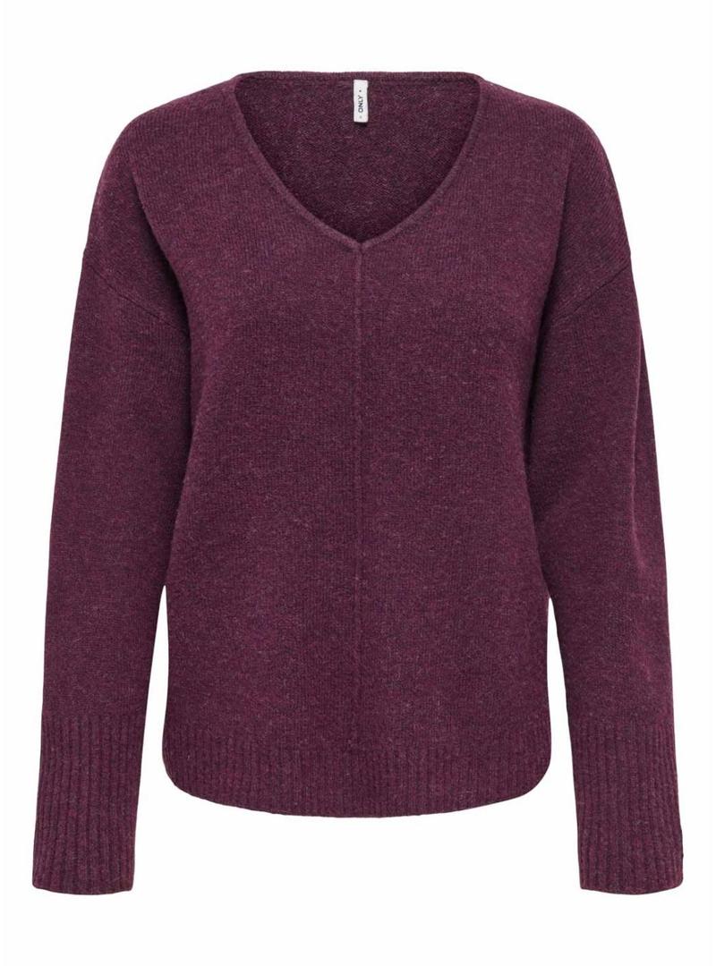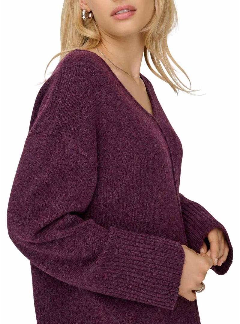 Camisola Only. Modelo Whitney. Cor granada. Decote em V. Costura central. Extremidades caneladas. Ajuste folgado. Ombros caídos. Tecido macio ao toque.