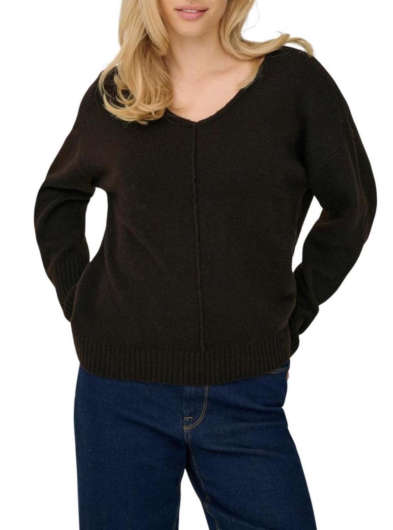 Camisola Only. Modelo Whitney. Cor marrom. Decote em V. Costura central. Extremidades caneladas. Ajuste folgado. Ombros caídos. Tecido suave ao toque.